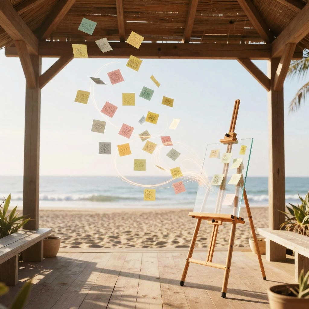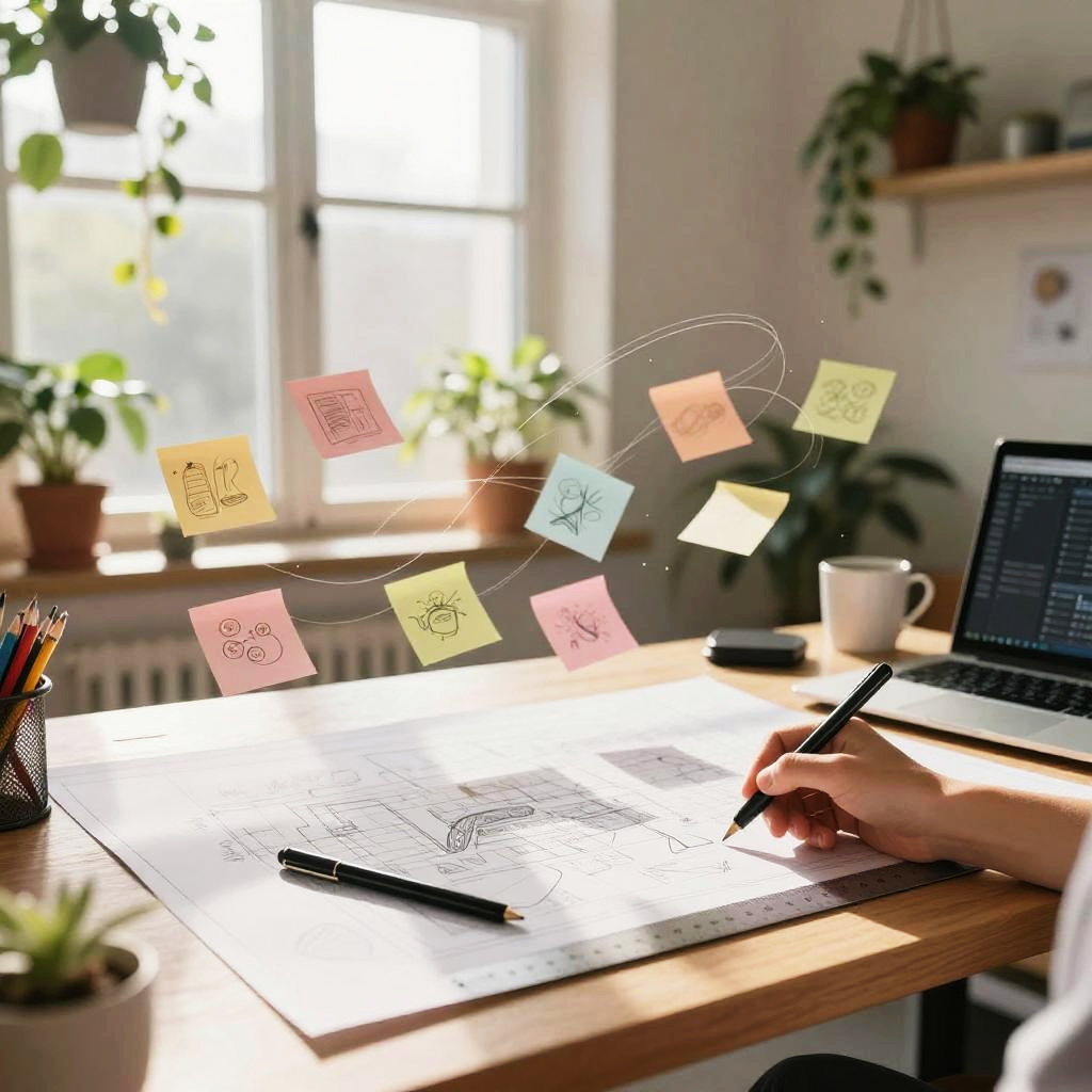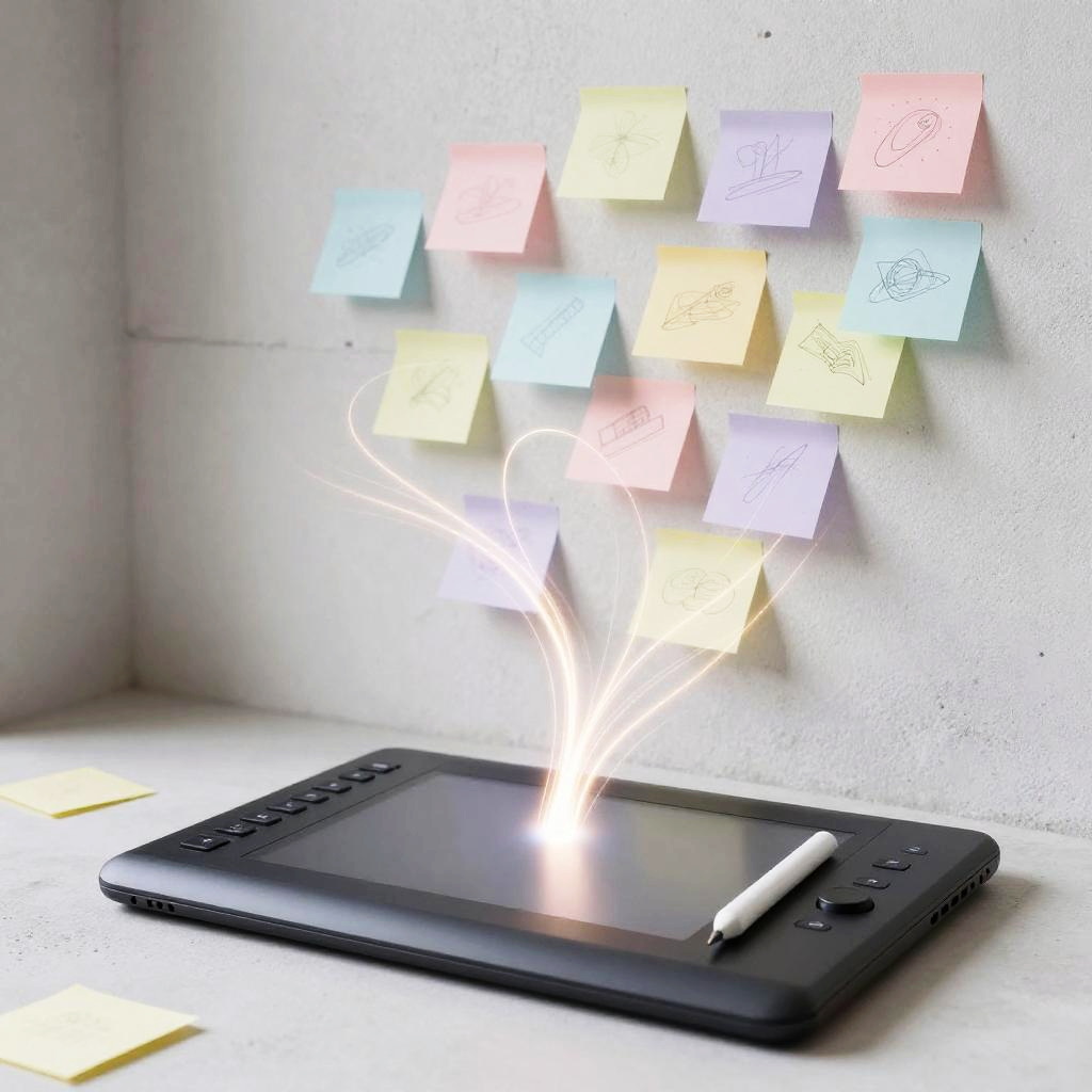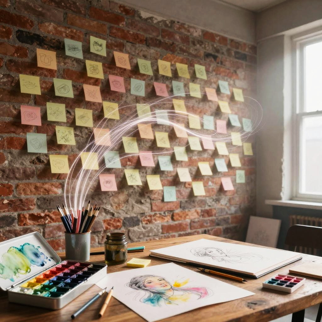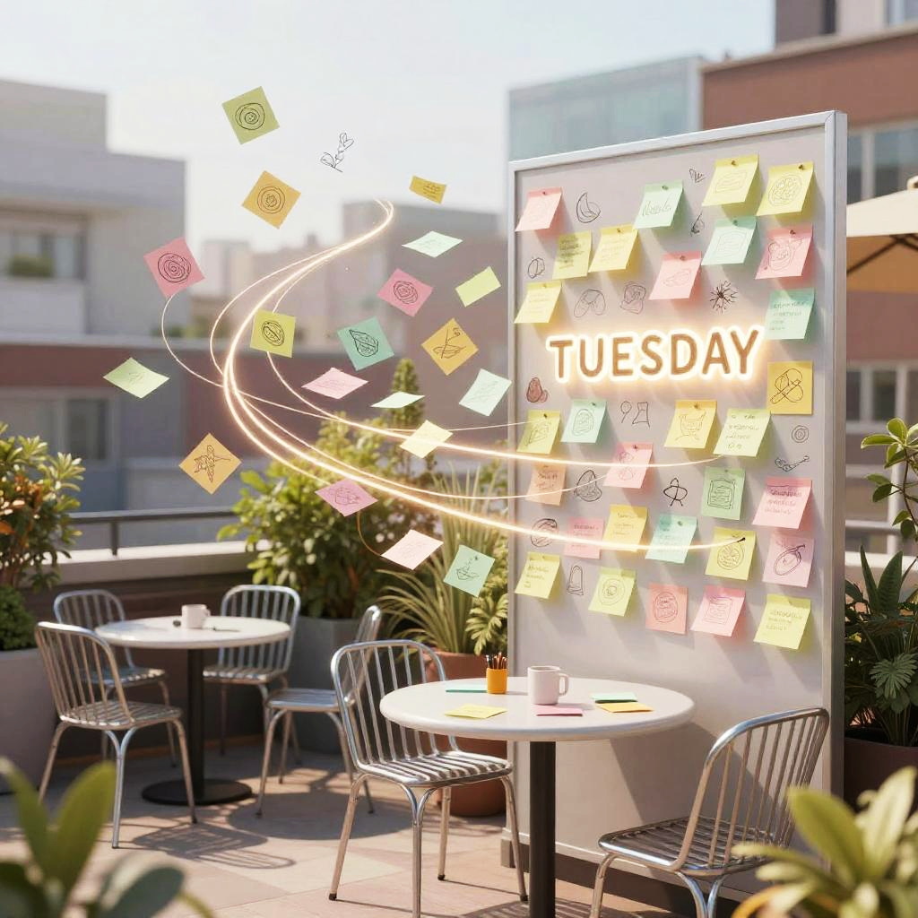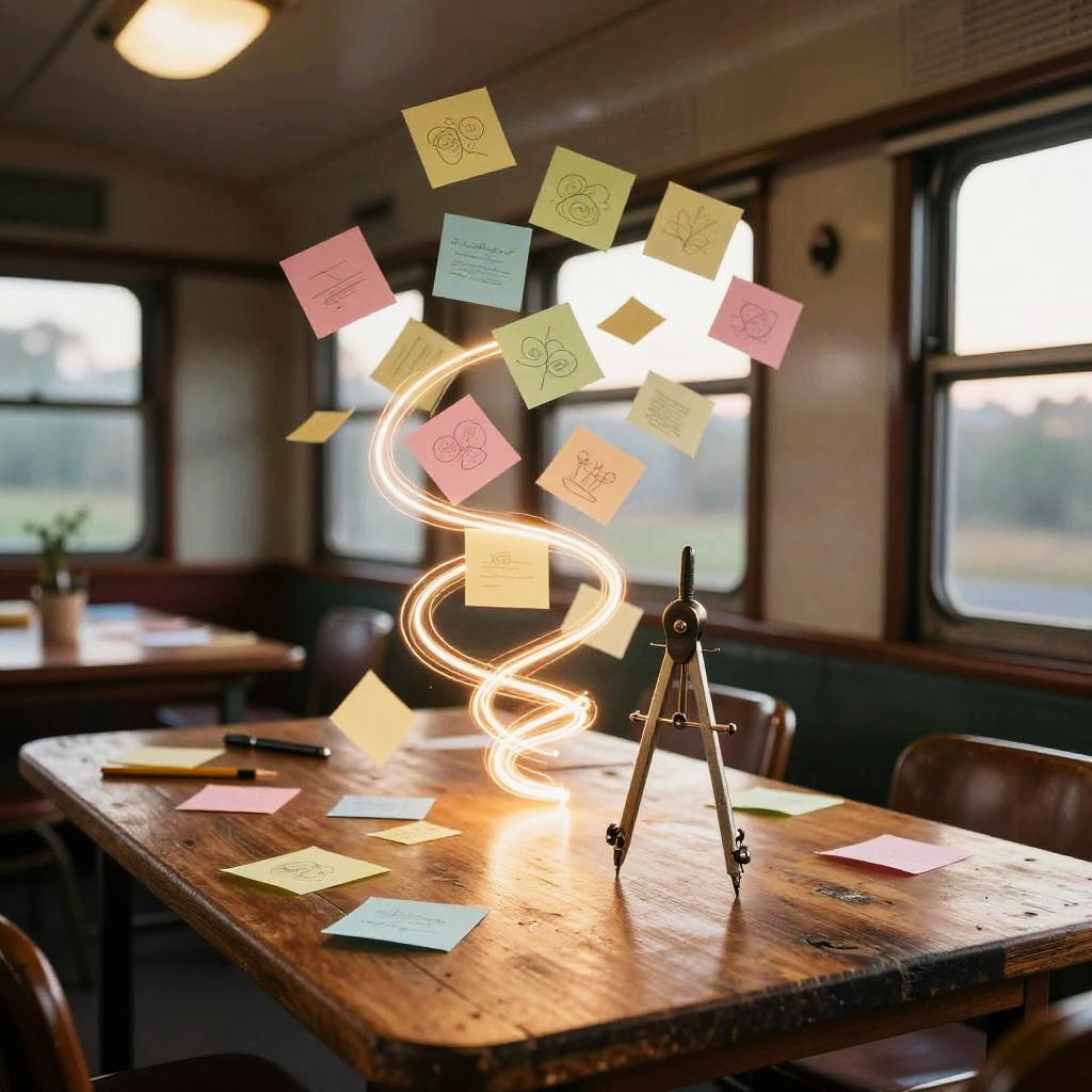 Weekly team ideation circle unfolds in bright open-plan office with floor-to-ceiling windows, floating pastel sticky notes and abstract doodles drift and cluster, swirling light trails weave around curved multi-screen setup displaying flowcharts; vibrant yet clean, cinematic composition, volumetric glow, tactile surfaces, crisp textures, ultra detailed, soft haze, optimistic, inspiring creativity