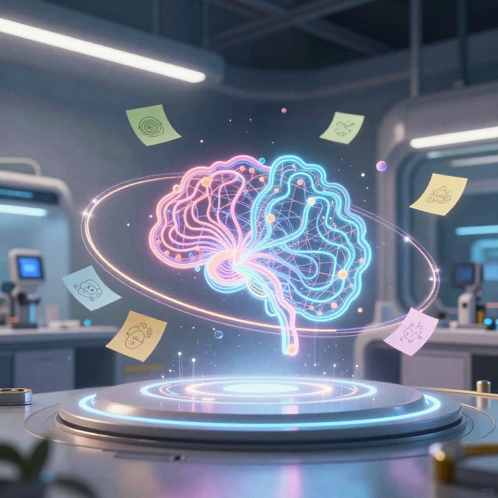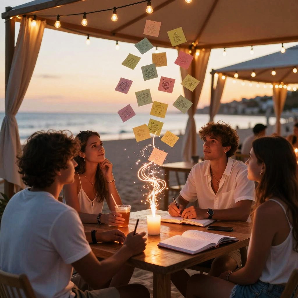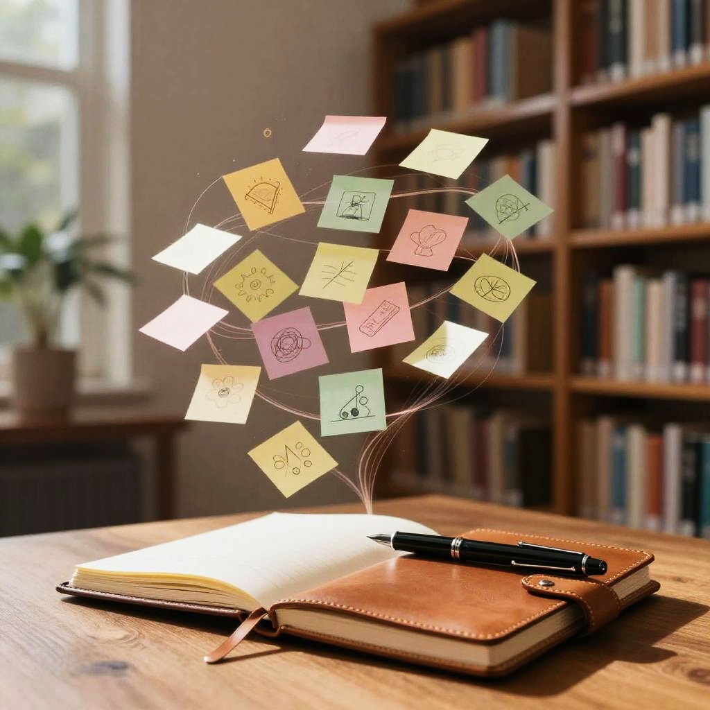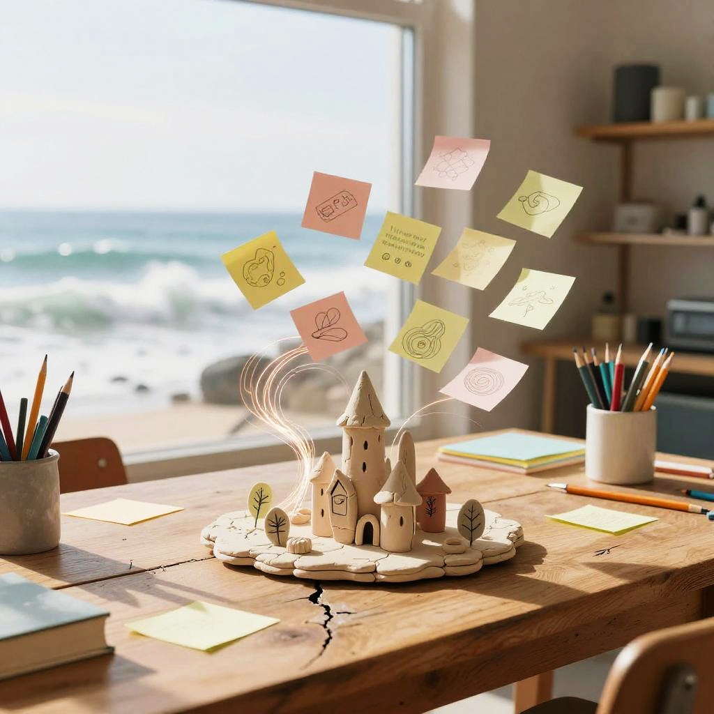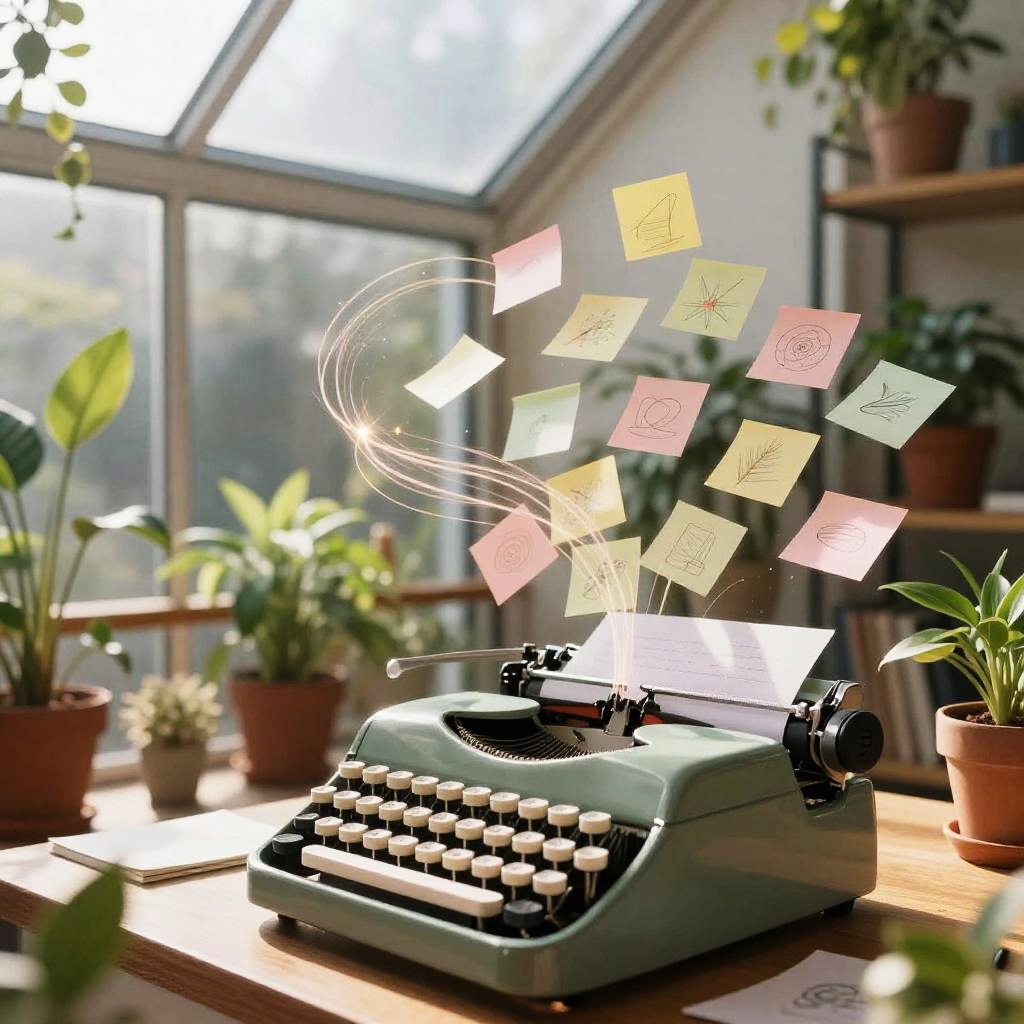 Weekly team ideation circle unfolds in bright open-plan office with floor-to-ceiling windows, floating pastel sticky notes and abstract doodles drift and cluster, swirling light trails weave around curved multi-screen setup displaying flowcharts; vibrant yet clean, cinematic composition, volumetric glow, tactile surfaces, crisp textures, ultra detailed, soft haze, optimistic, inspiring creativity
