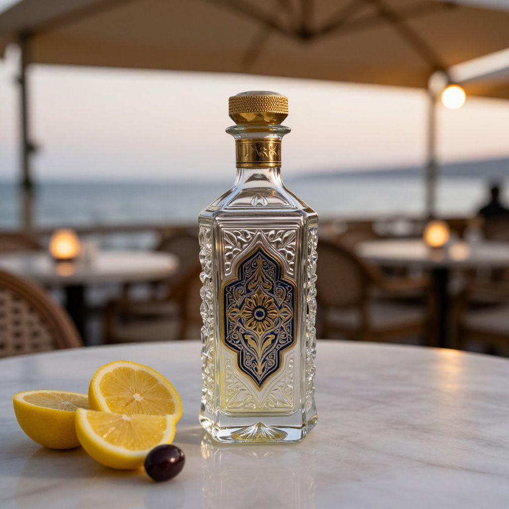 Raki bottle with intricate Ottoman design, crystal glass half full, placed on a marble table with lemon slices and olives, soft warm lighting, blurred background of a seaside café at dusk, capturing the essence of Turkish culture and tradition
