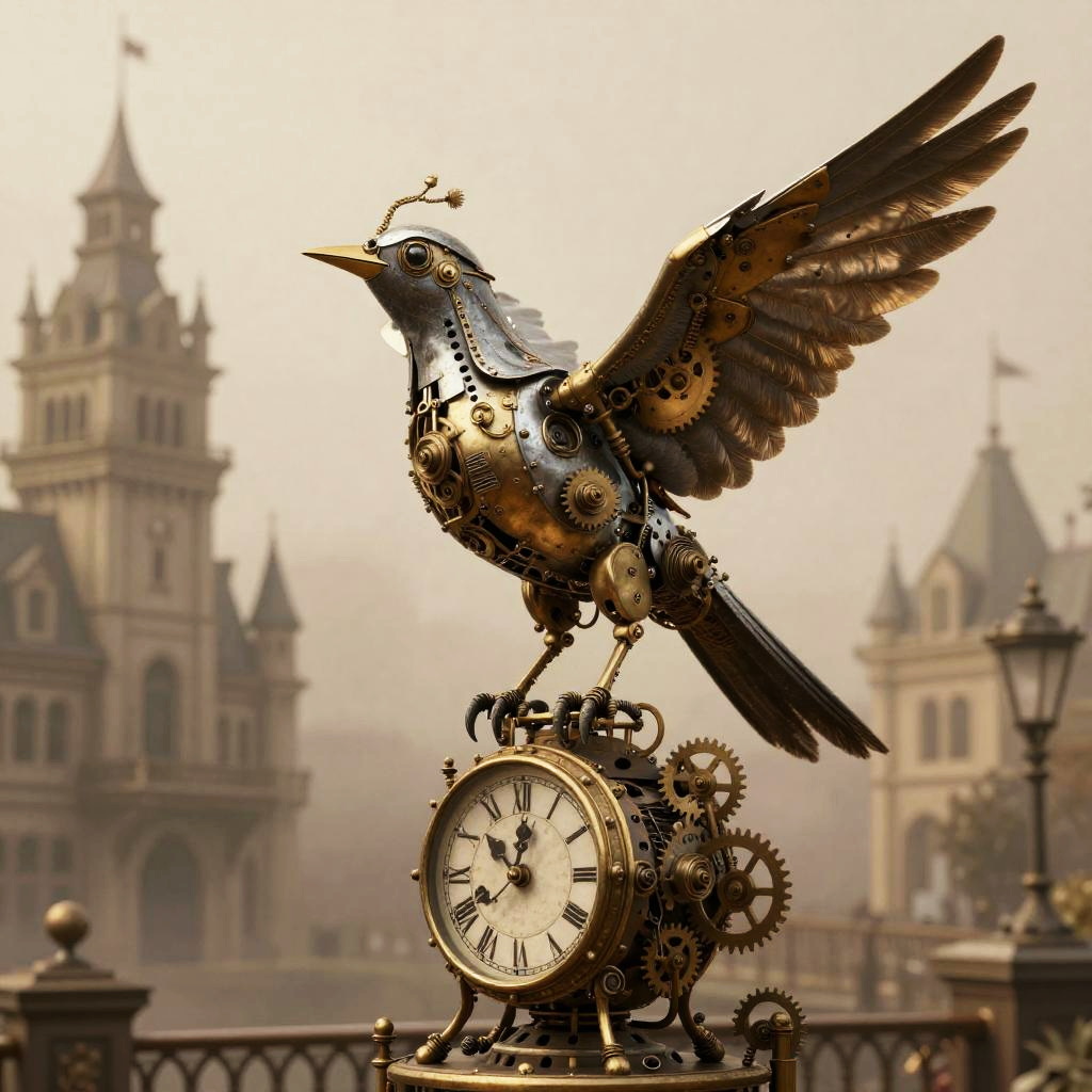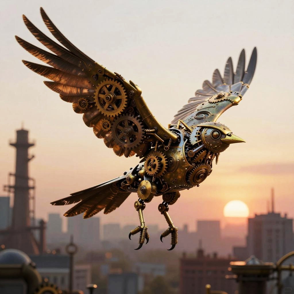 AI draw me a steampunk-inspired mechanical bird in flight, with intricate gears and brass details, set against an industrial city backdrop at sunset.