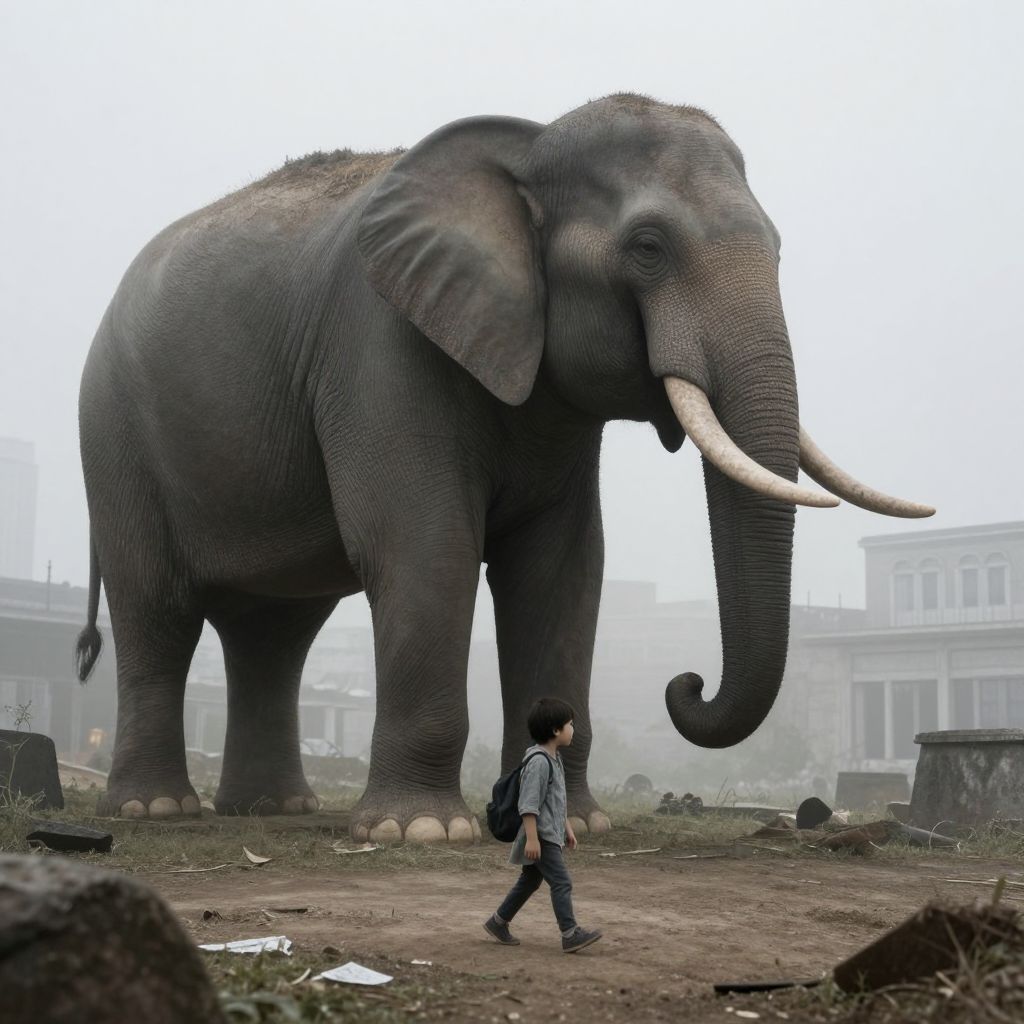 In a fog-shrouded cityscape where the mundane meets the surreal, a child walks alone, their small form dwarfed by the looming presence of an ancient elephant, embodying the quiet resilience of innocence amidst the forgotten echoes of a world long past.