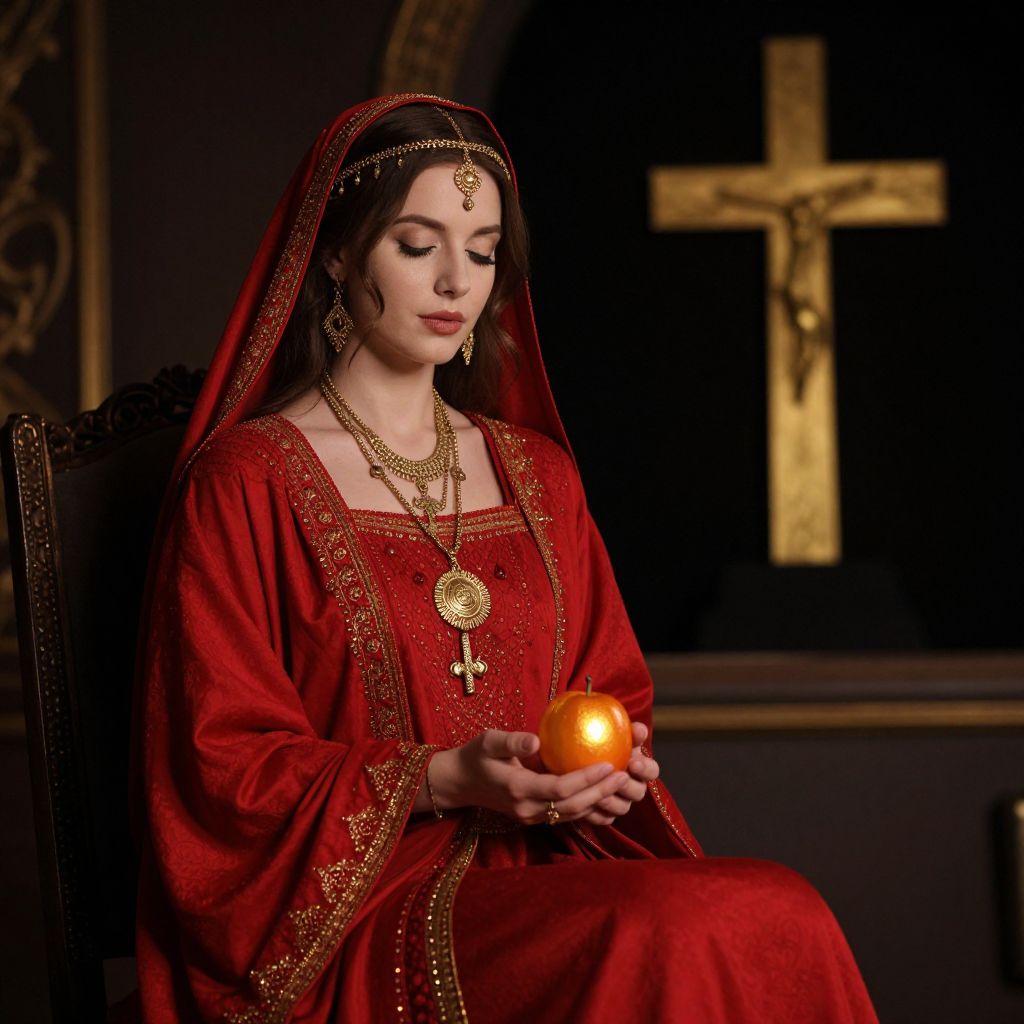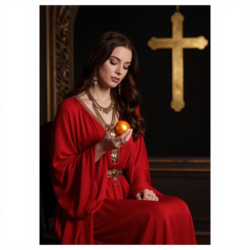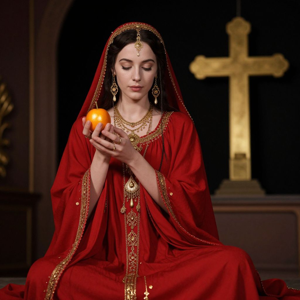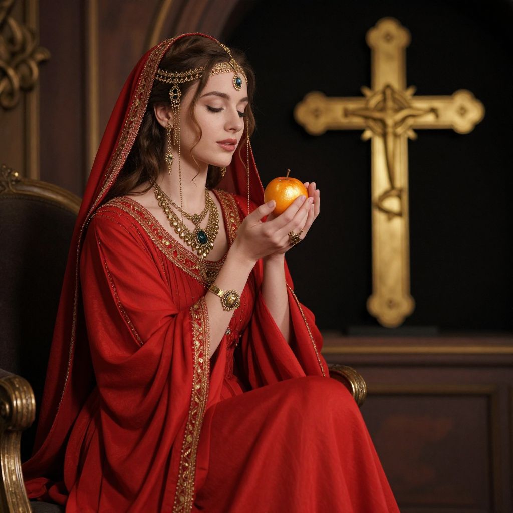 Seated gracefully in a dimly lit chamber, a woman adorned in vibrant red attire and intricate gold jewelry holds a small, golden-orange fruit in her delicate hands, while a golden cross hangs prominently against the dark background to her right.