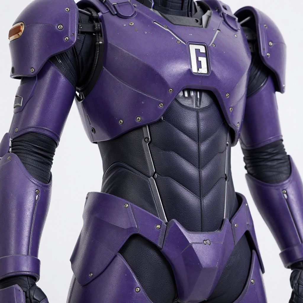 Photorealistic digital artwork of a futuristic, purple armored suit worn by a humanoid figure. The suit features angular, segmented armor plates with a matte finish and metallic accents. The chest plate has a white, rectangular emblem with a black "6" in the center. The black, textured abdomen is segmented with visible seams. The right shoulder has an orange insignia. The background is plain white, highlighting the detailed armor. The suit's design is reminiscent of sci-fi or mecha styles, with a focus on functional yet highly protective armor.