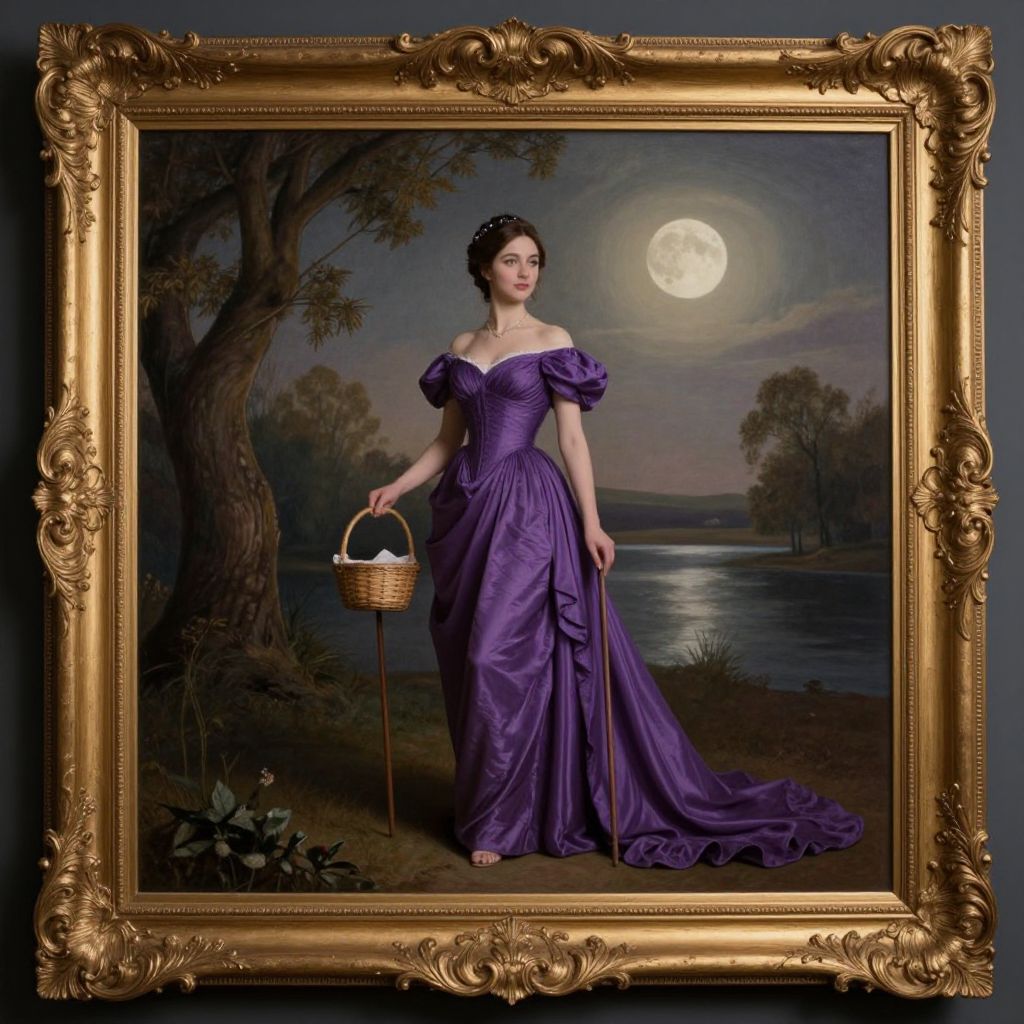 Elegant portrait framed in ornate gold depicts a woman in a flowing purple gown, holding a basket and cane, set against a serene moonlit landscape with trees and water in the background.