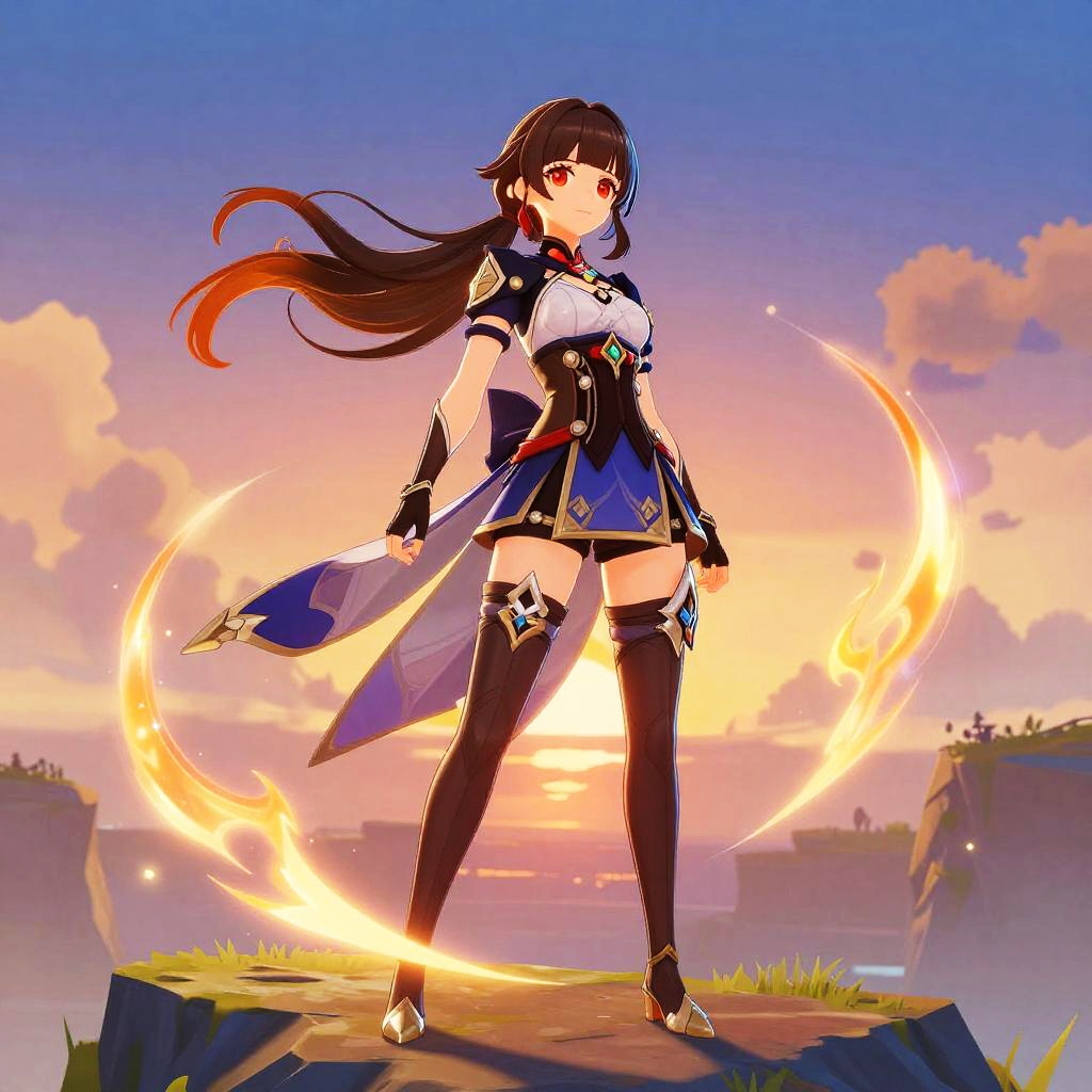 Girl Genshin character standing on a cliff at sunset, flowing hair and detailed fantasy armor, magical elemental aura surrounding her, vibrant colors, highly detailed style