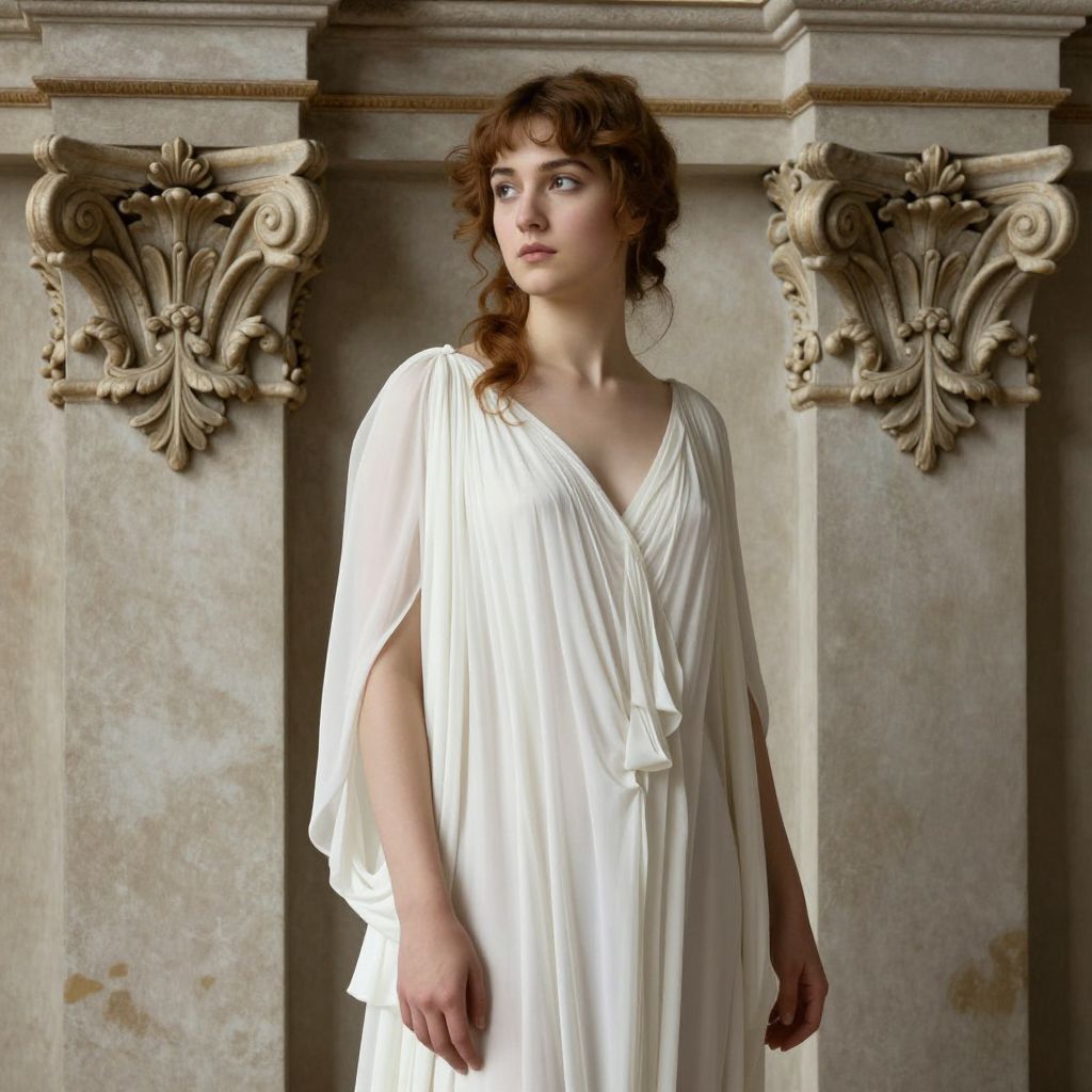 Photograph of a young woman with fair skin and wavy, medium-brown hair standing in front of ornate, classical stone columns with intricate, carved floral motifs. She wears a loose, white, toga-like dress with a V-neck and soft, flowing fabric. Her expression is contemplative, with slightly upturned eyes looking off to the side. The stone columns are light gray with subtle weathering, and the light in the image is soft, casting gentle shadows. The overall style evokes ancient Greek or Roman aesthetics. The woman's delicate features and natural beauty contrast with the detailed, aged architecture behind her.