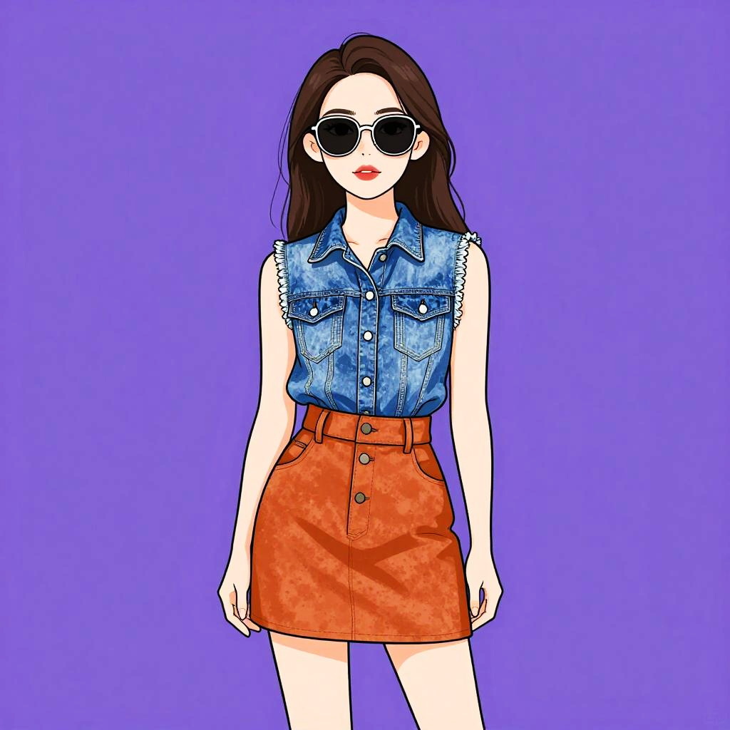 Woman with pretty face and pretty hair. Woman, casual chic, wrap-style mini dress in light blue with red and white speckled pattern, short ruffle sleeves, v-neckline, side tie at the waist, ruffled hem, natural makeup, messy bun, plain white studio background. --sref 1467