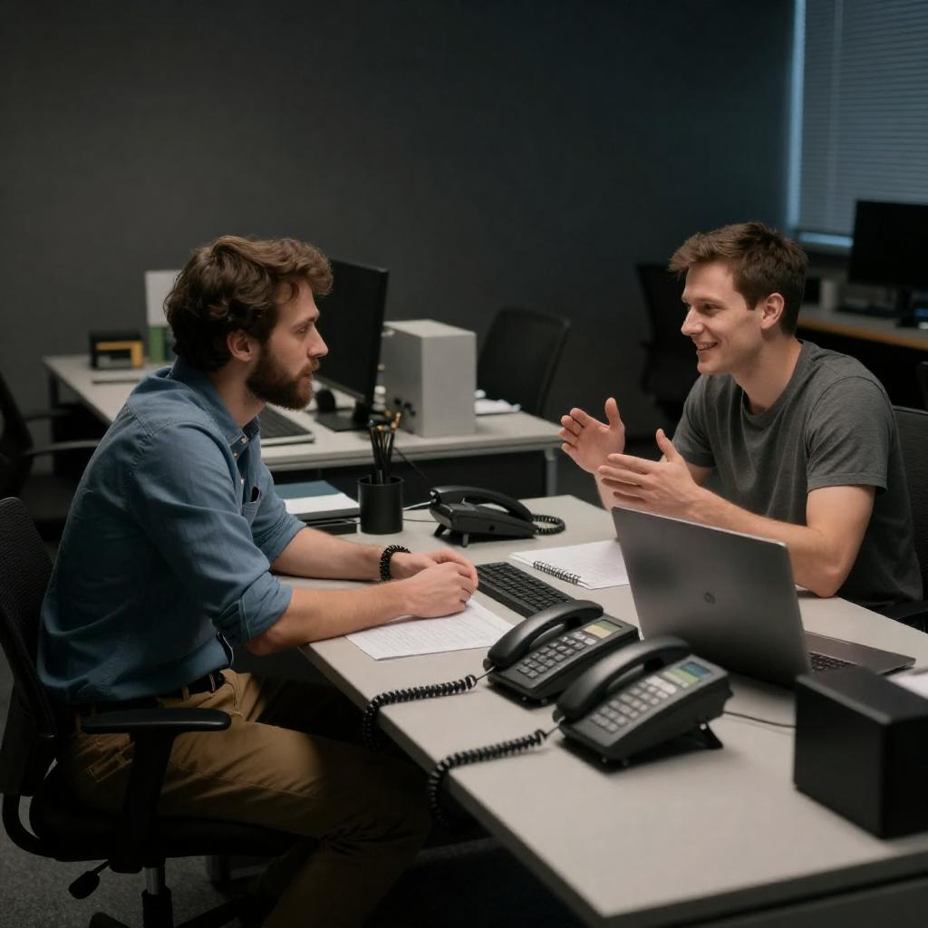 Photograph of a film set. Two men: one seated in a chair with a headset, wearing a blue shirt and brown hat; the other standing, wearing a beige vest and yellow pants. Background has various lights, cables, and equipment. The seated man looks up at the standing man. Bright lighting.