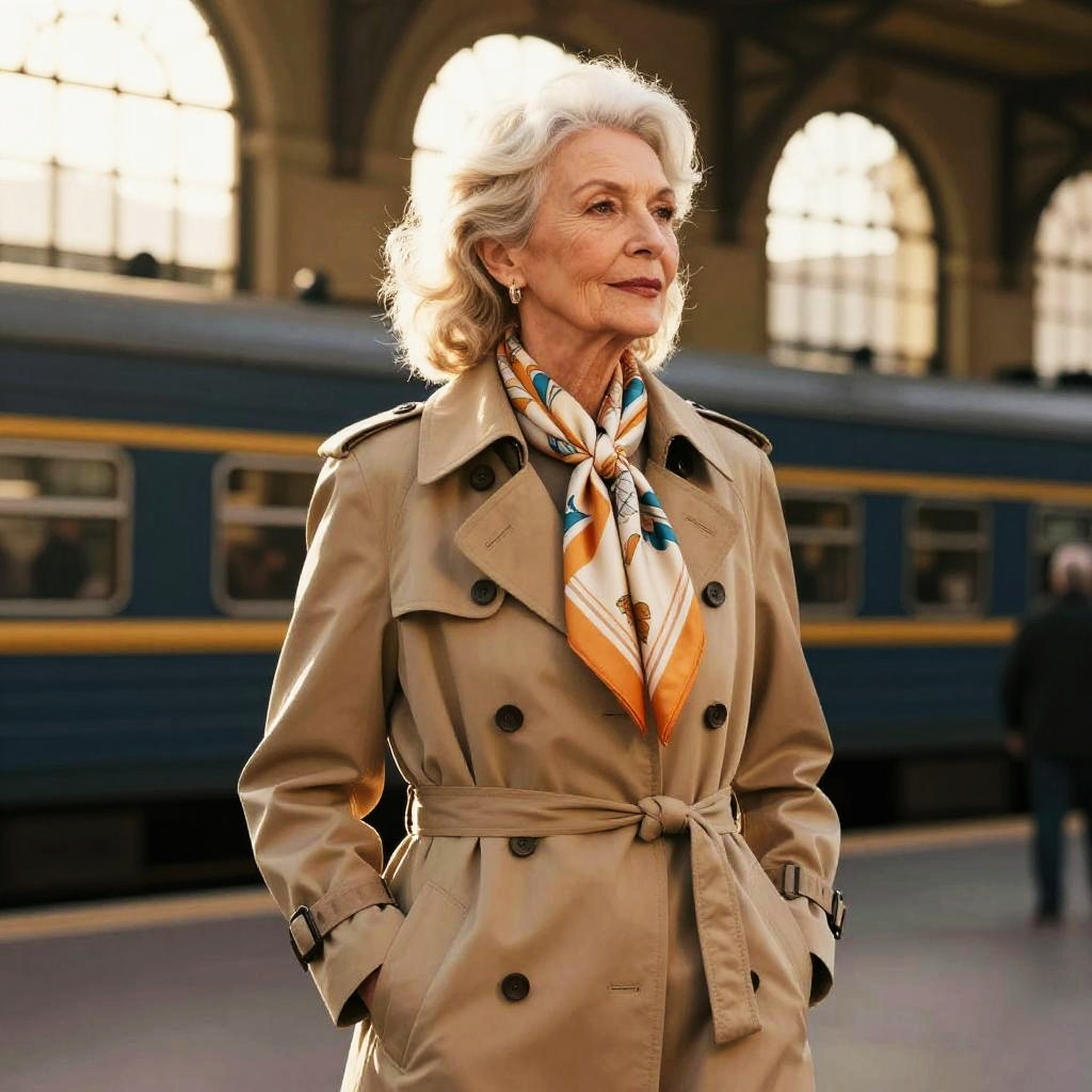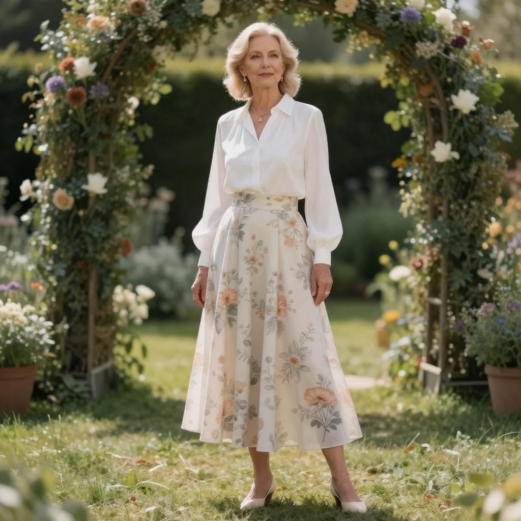 Elegant Elderly Woman in Silk Blouse and Pleated Skirt in European Square
