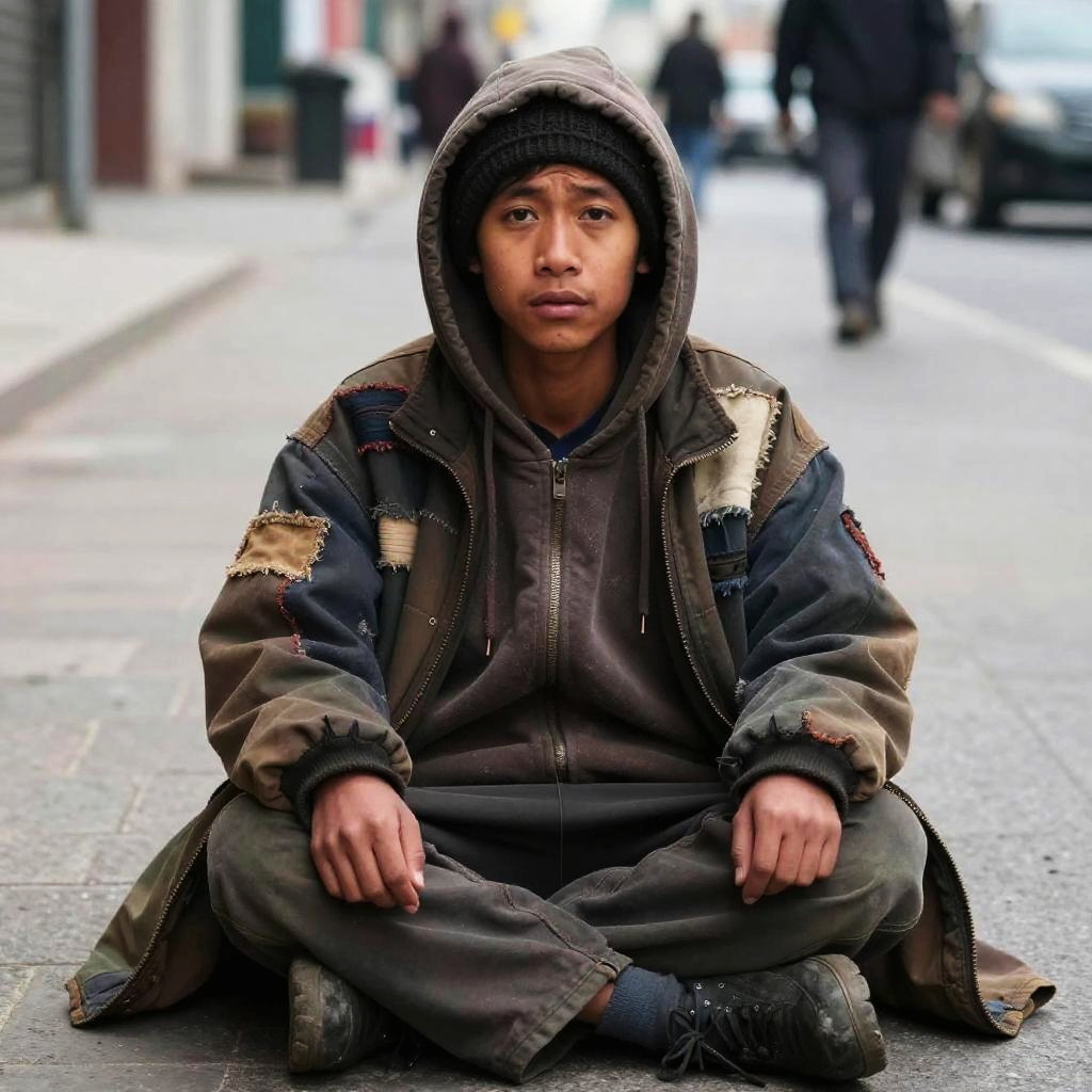 Photograph of a young, concerned-looking man with medium brown skin, sitting cross-legged on a city street, wearing a worn, hooded jacket and