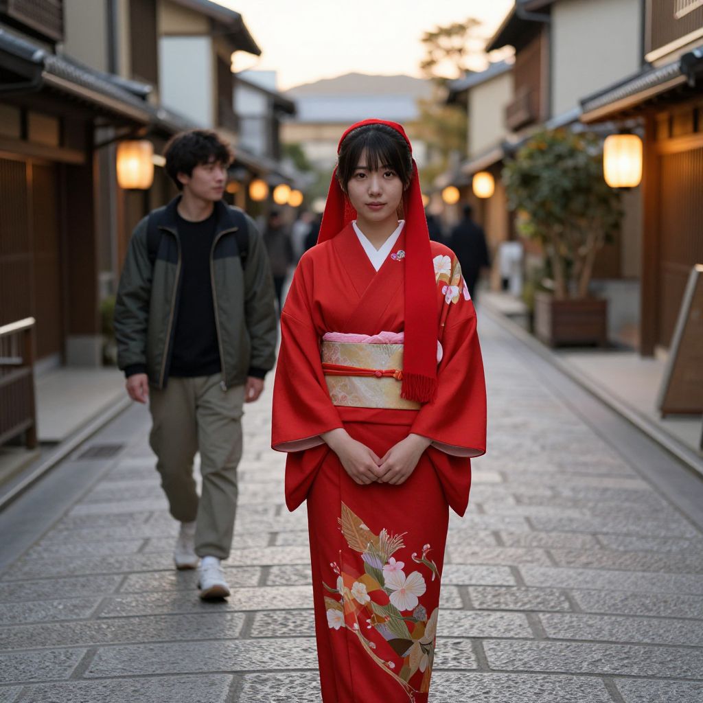 A beautiful young woman in a vibrant red kimono with a matching red headband and a flowing red scarf wrapped around her head stands confidently on a quiet cobblestone street at golden hour. The street is lined with traditional Japanese-style buildings and lanterns casting soft shadows. In the background, a young man in a modern jacket and casual pants walks toward her, observing with a gentle expression. The scene is softly lit, with warm, ambient lighting highlighting the rich colors of the kimono and the textures of the stone pavement. The atmosphere is peaceful and timeless, blending traditional Japanese aesthetics with a subtle sense of modern connection.