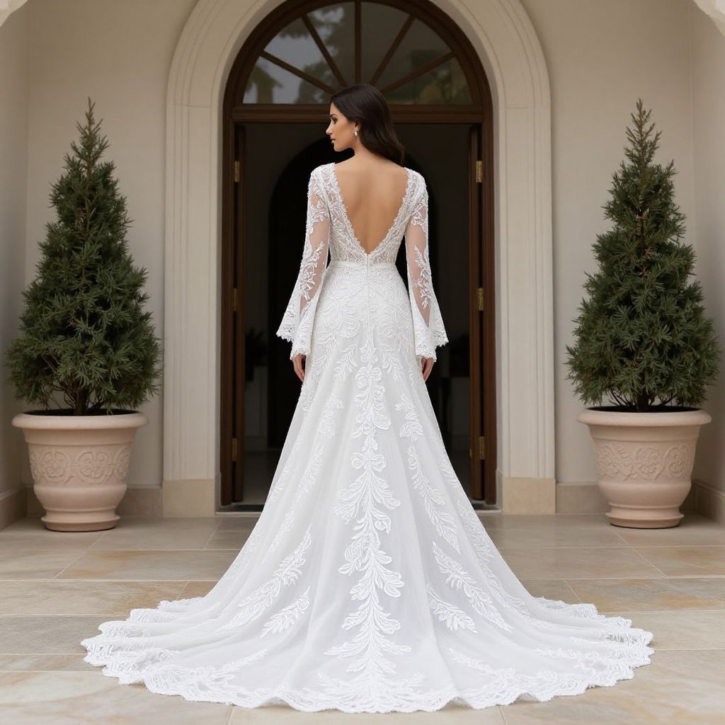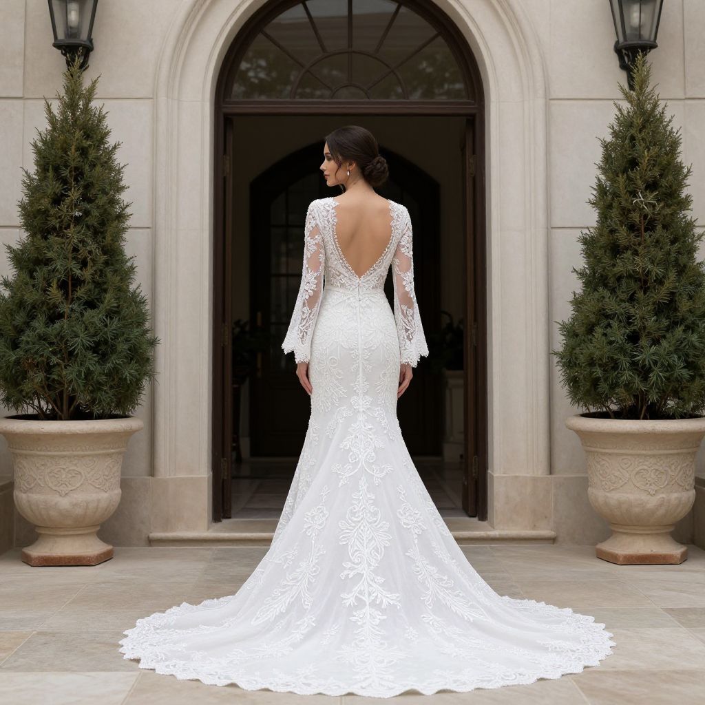 Elegant Tarik Ediz wedding dress featuring long lace bell sleeves, a sheer back, and intricate floral embroidery, gracefully draped over a woman standing before a grand arched doorway flanked by two potted evergreen shrubs.