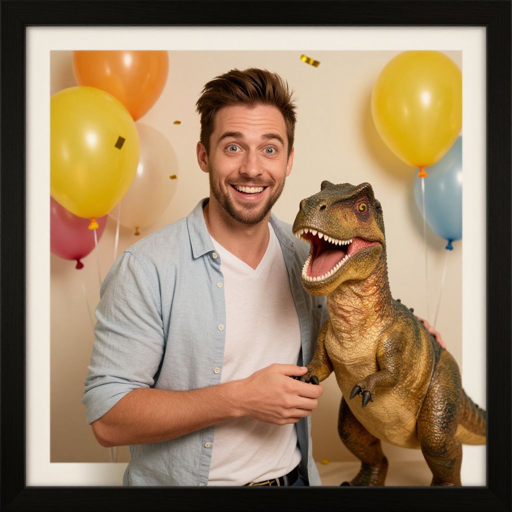 Framed portrait of a smiling man in casual attire, surrounded by balloons and confetti, holding hands with a friendly-looking, lifelike dinosaur standing beside him. Soft, warm lighting illuminates the scene, highlighting their joyful expressions. Bright colors pop against neutral background, emphasizing the whimsical nature of this special occasion. Man has masculine face and piercing eyes