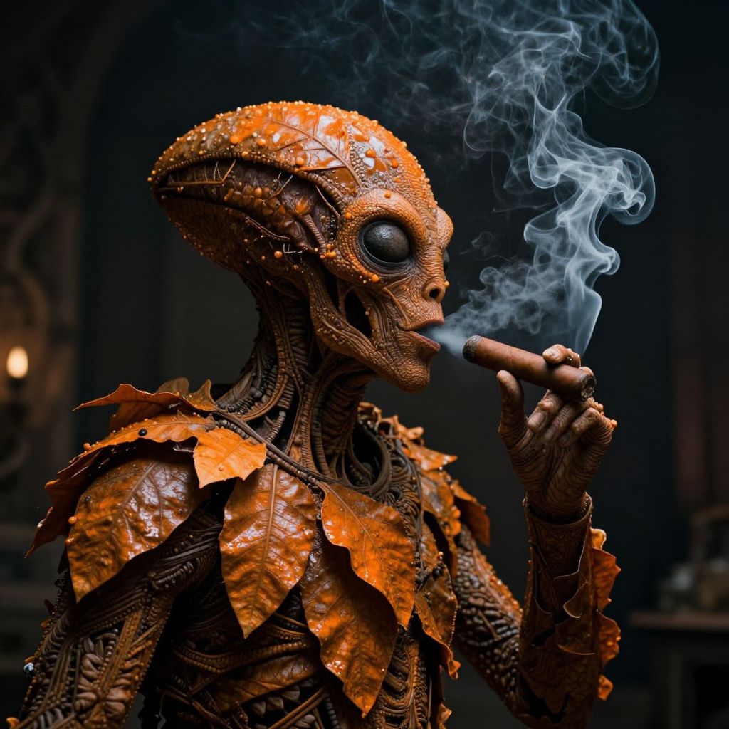 A dramatic, dark science fiction portrait of an alien plant man made of orange leaves, smoking a cigar and blowing smoke wildly, with cinematic lighting and a contrast-rich, cinematic shot.