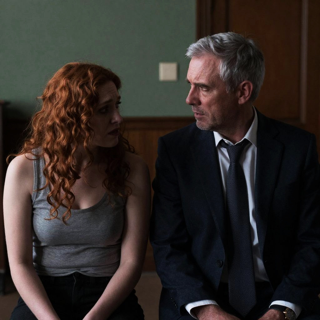 Middle-aged man with thinning gray hair, wearing a dark coat and black gloves, intently reading a newspaper in front of a stained glass window. He holds the newspaper with both hands, partially covering his face.