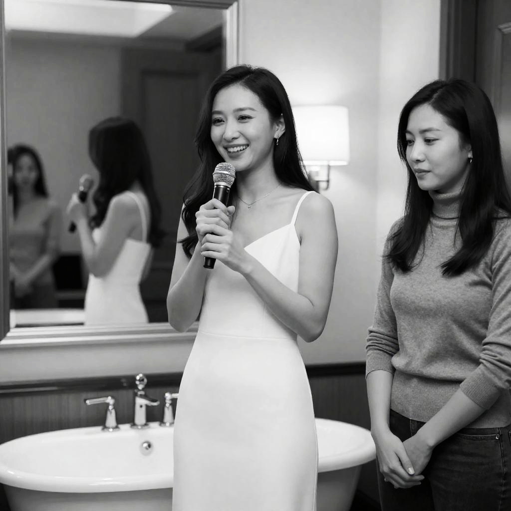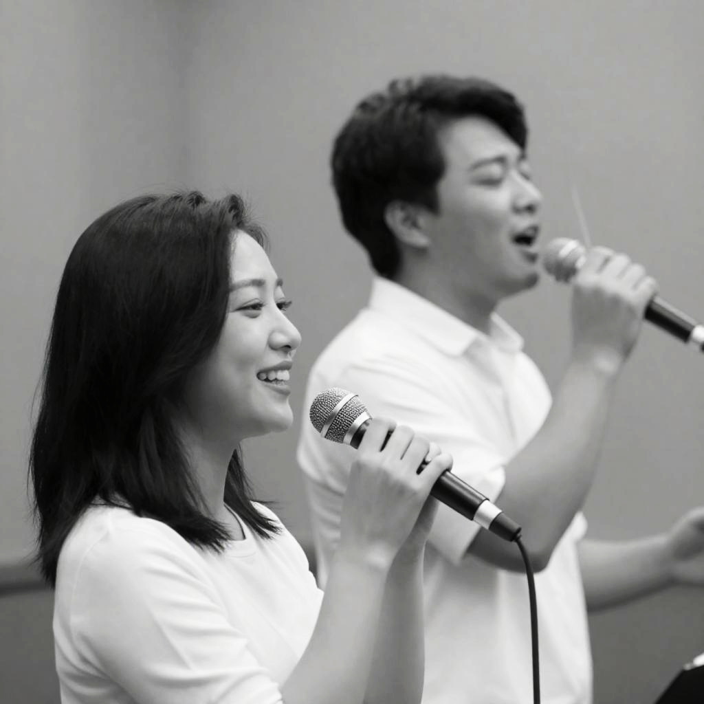 Black and white photograph of two people singing into microphones. The woman with dark, shoulder-length hair in the foreground holds a conductor's baton, smiling. The man with dark hair and closed eyes stands behind her, also singing. Both wear white shirts. The man's right hand grips the microphone. Background is a plain wall.