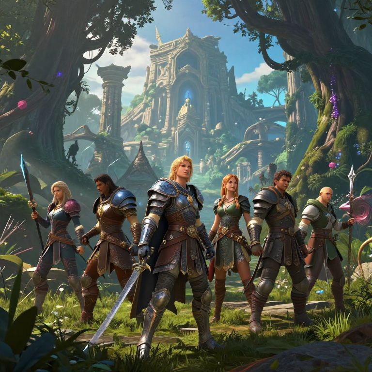 RPGs adventure scene with a diverse group of heroes exploring a mystical forest, ancient ruins in the background, vibrant colors, epic fantasy style, detailed character armor and weapons, dynamic lighting, cinematic atmosphere.