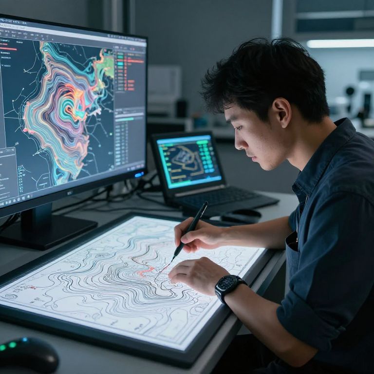 A contour map maker at work in a high-tech lab, creating detailed topographic maps with layered elevation lines, digital drafting tools glowing softly, surrounded by floating holographic maps, ambient lighting highlighting precision and geographic data complexity, ultra-realistic style.