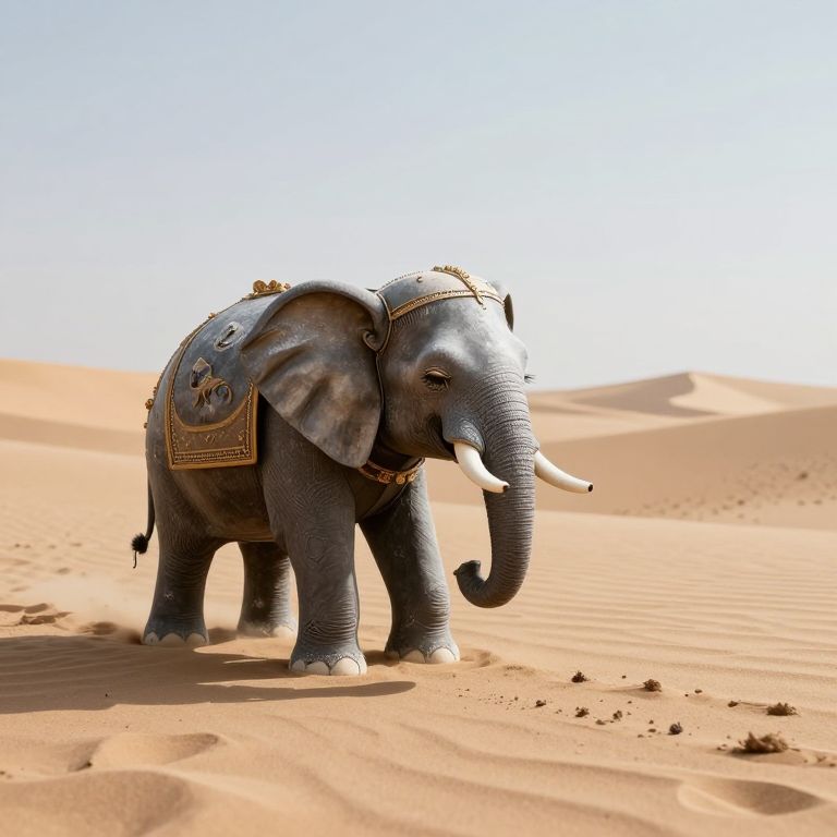 Photograph of a large, gray elephant adorned with ornate, gold-trimmed saddles and decorations, standing in a bright, sandy desert. The elephant has white, curved tusks and large, floppy ears. The saddle features intricate patterns and small, gold embellishments. The desert has smooth, undulating dunes under a clear, blue sky. Shadows from the elephant and dunes create patterns on the sand. The elephant's skin appears textured and wrinkled, contrasting with the smooth, soft sand. The overall scene is bright and sunlit, emphasizing the contrast between the elephant and the desert.