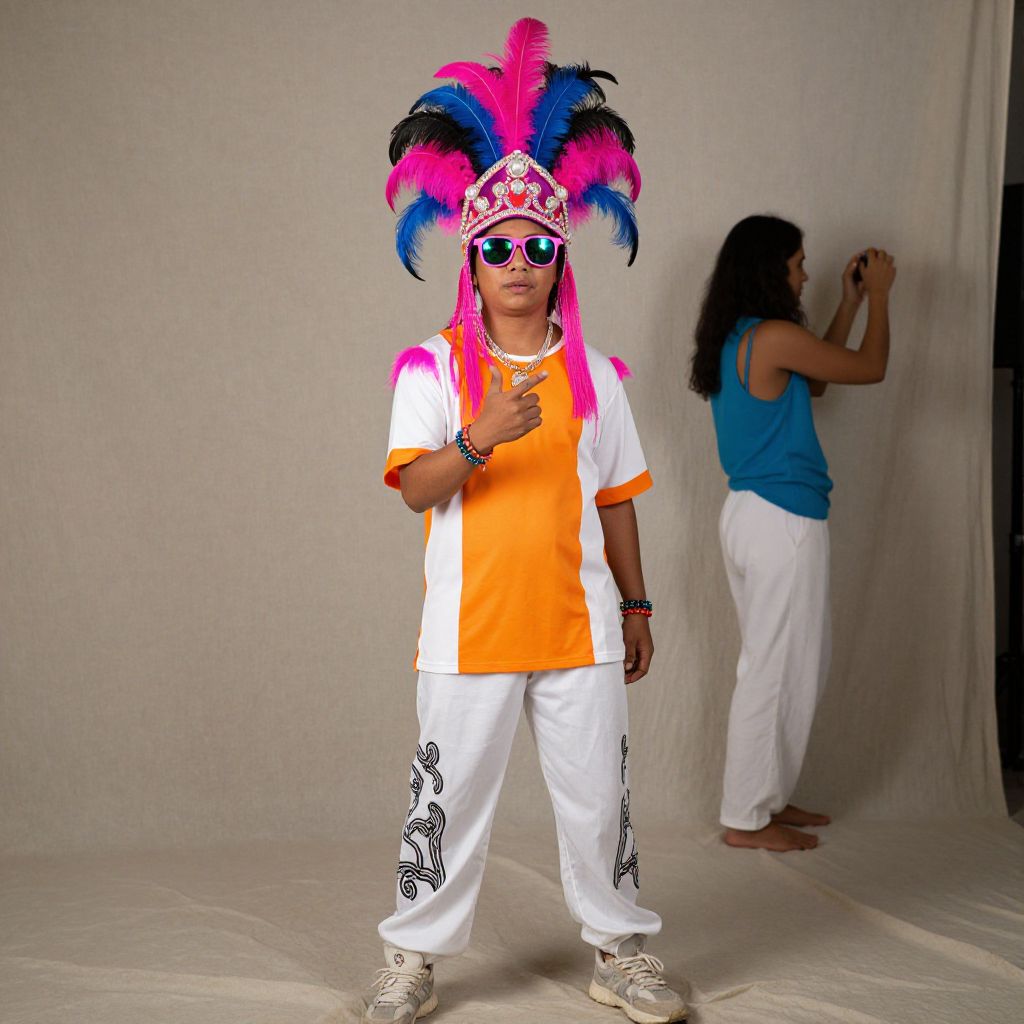 Photograph of a person dressed in a vibrant, colorful costume. They wear a large, pink, blue, and black feathered headdress, reflective sunglasses, an orange and white shirt, white pants with black patterns, and beige sneakers. They're making a hand gesture and standing in front of a plain, draped background. A person in a blue tank top and white pants is slightly blurred in the background, taking a photo.
