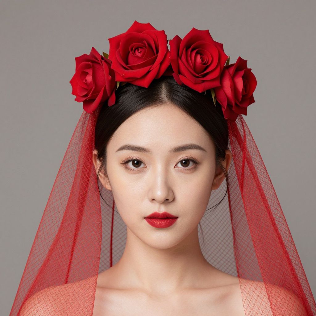 Woman wearing a vibrant red crown adorned with four large roses and a matching netted veil, styled elegantly against a neutral background.