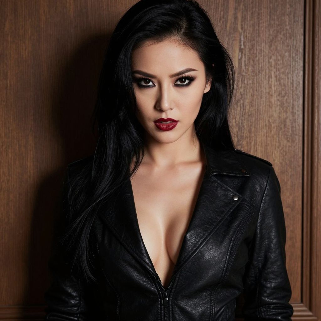 Photograph of a fierce-looking woman with long black hair, wearing a deep V-neck black leather jacket that shows significant cleavage. Her makeup is dramatic with bold red lipstick and dark eye makeup. She stands against a wooden background, looking directly at the camera with a intense expression. The lighting highlights her dark, sultry appearance, giving her a mysterious and powerful vibe.