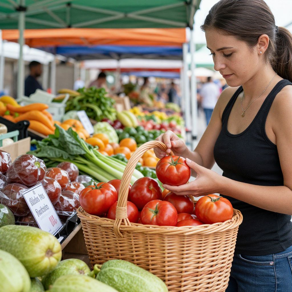 Photograph of a fair-skinned, brunette woman with wavy hair, wearing a navy sleeveless top, standing at an outdoor market. She is selecting ripe red tomatoes from a blue crate, while holding a wicker basket filled with tomatoes. The background features colorful market stalls with green, red, and yellow canopies, displaying a variety of fresh vegetables including zucchinis, bell peppers, and eggplants. The market is bustling with blurred figures in the background. The image has a vibrant, lively feel, emphasizing the freshness and abundance of the produce.