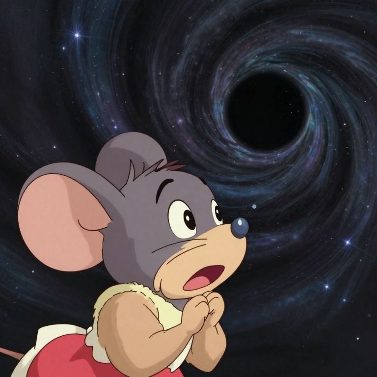 Magic style, Cartoon mouse, wide-eyed in astonishment, peering at a spiraling black hole consuming the cosmos, Hayao Miyazaki-inspired, characters with exaggerated features, black hole warping starfield backdrop, interplay of fear and wonder in facial expression, soft color palette, hand-drawn animation feel, digital painting, volumetric light effects, ultra fine details