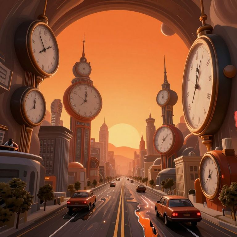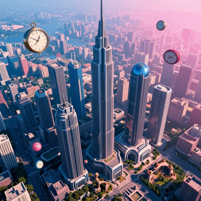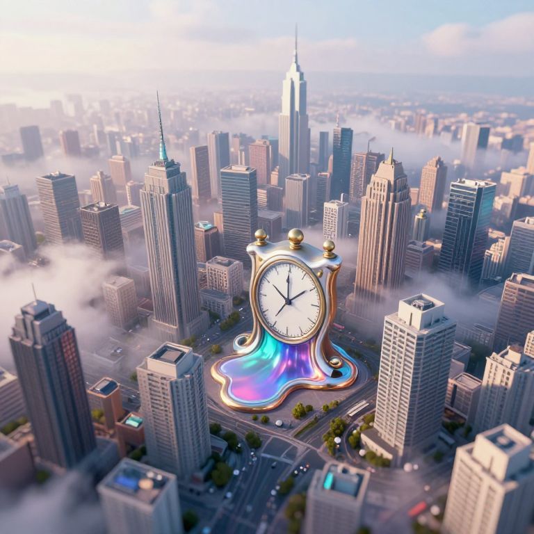 A breathtaking scene depicting an aerial view of a surreal cityscape, reminiscent of Dali's dreamlike imagery. The metropolis is composed of towering edifices sculpted from gleaming metals, their surfaces reflecting the ever-shifting light of the sky above. Each structure is intricately designed as colossal clock faces, with hands that move languidly against an ethereal backdrop of swirling mists and clouds, evoking a sense of both enchantment and unease in the observer. This fantastical vision captures the essence of time itself bending under the weight of these monumental creations, blurring the lines between reality and the realm of dreams.