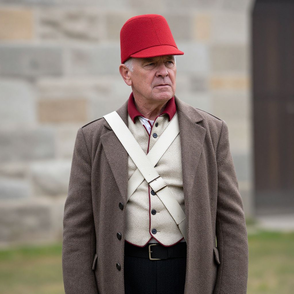 Photograph of an elderly white man standing outdoors against a blurred stone wall background. He wears a bright red, flat-crowned hat, a brown woolen jacket, a white textured vest with black buttons, and a red shirt. A white crisscrossed sash is draped over his vest. His expression is serious, with slightly furrowed brows. The man's skin is fair with visible wrinkles, and he has short white hair. The grassy ground is visible at the bottom of the image. The overall style is historical or period costume.