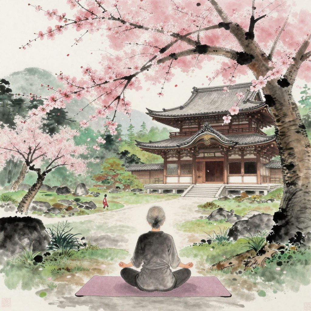 Anime-style drawing of a person meditating under cherry blossoms, facing a traditional Japanese temple with a serene garden.
