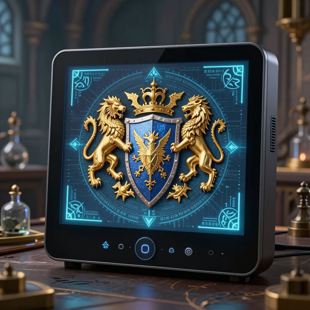 Crest generator interface, a sleek digital device creating customizable medieval crests with golden lions, dragons, and shields, surrounded by holographic heraldry patterns and ancient scripts, illuminated by soft light in a fantasy castle laboratory setting, detailed and vibrant.