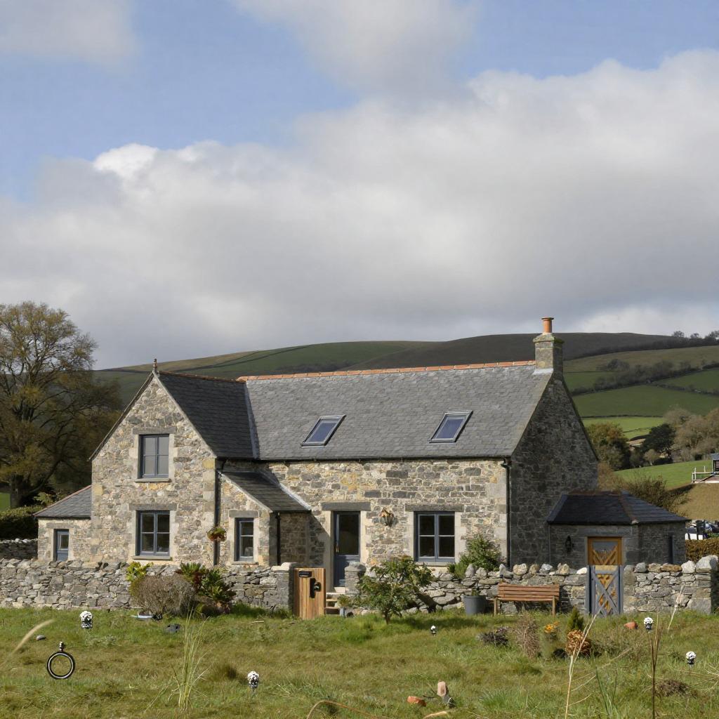 A modern stone cottage with a gray roof situated in a rolling countryside landscape. The house features large windows, skylights, and a chimney, surrounded by green grass, trees, and hills under a partly cloudy blue sky.