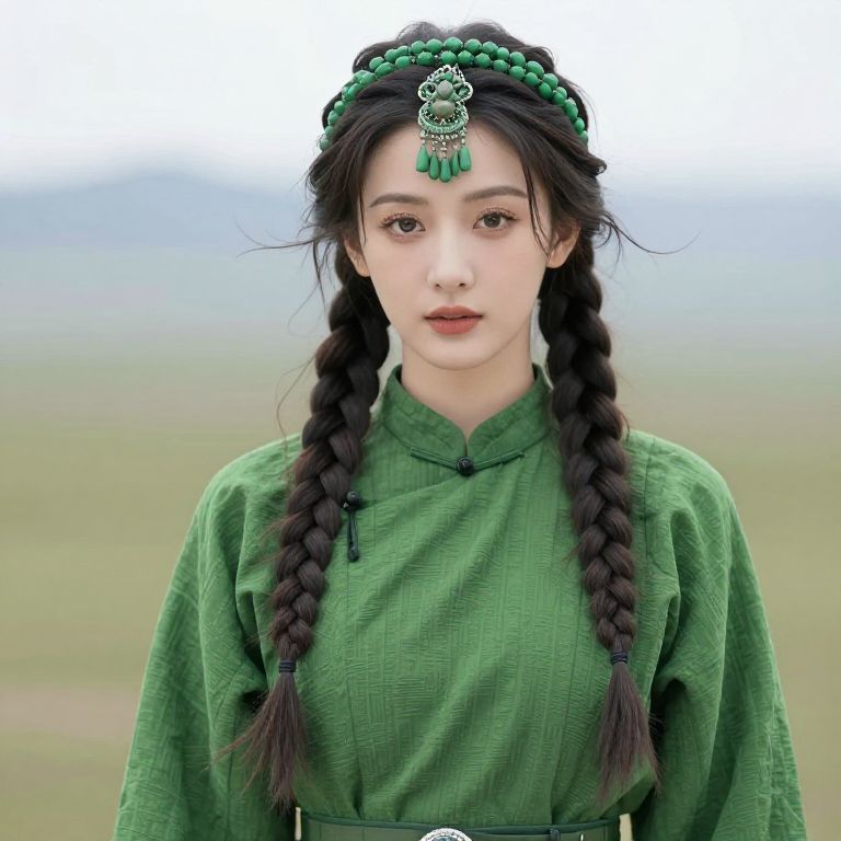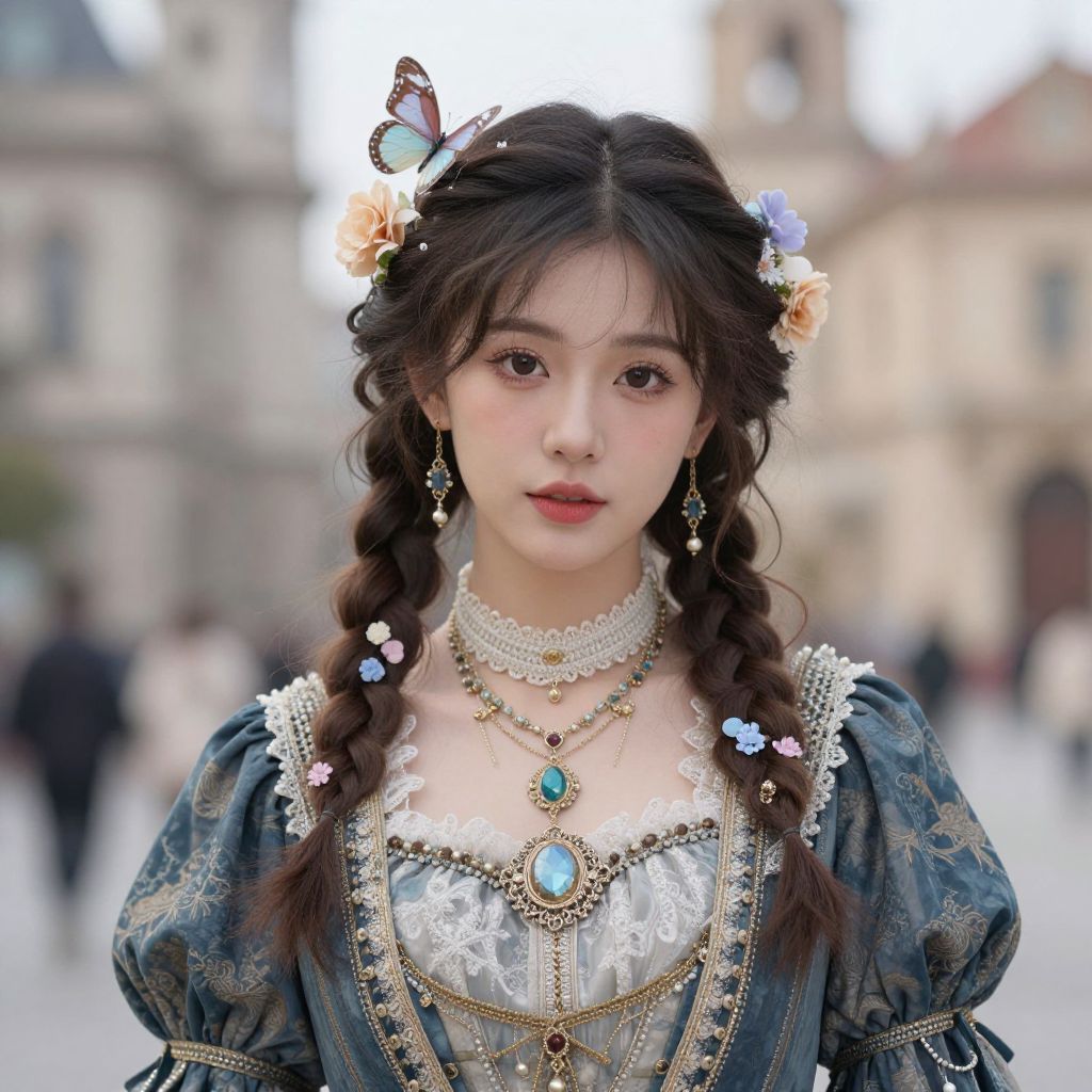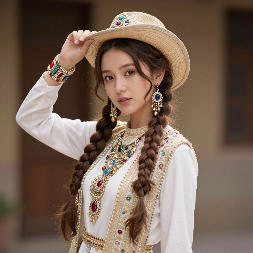 Rasputia costume, 1girl, solo, jewelry, earrings, braid, hat, long hair, bracelet, looking at viewer, long sleeves, brown hair