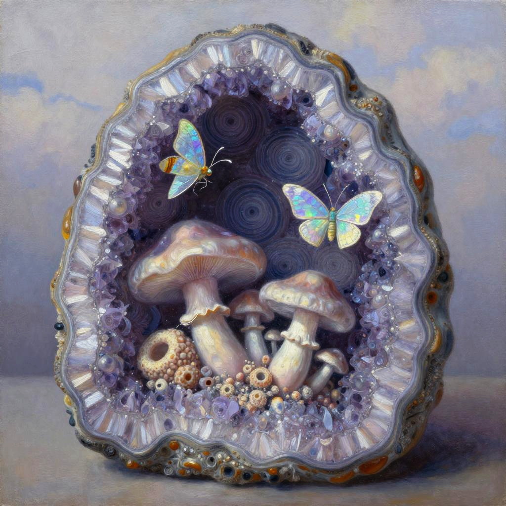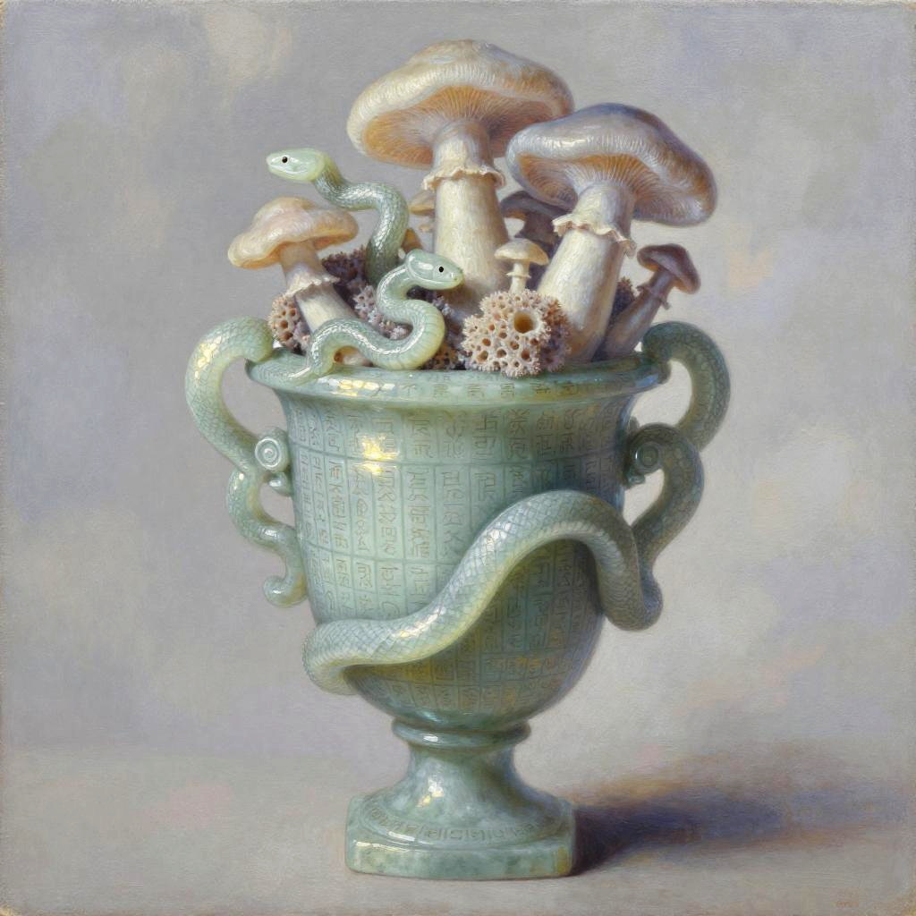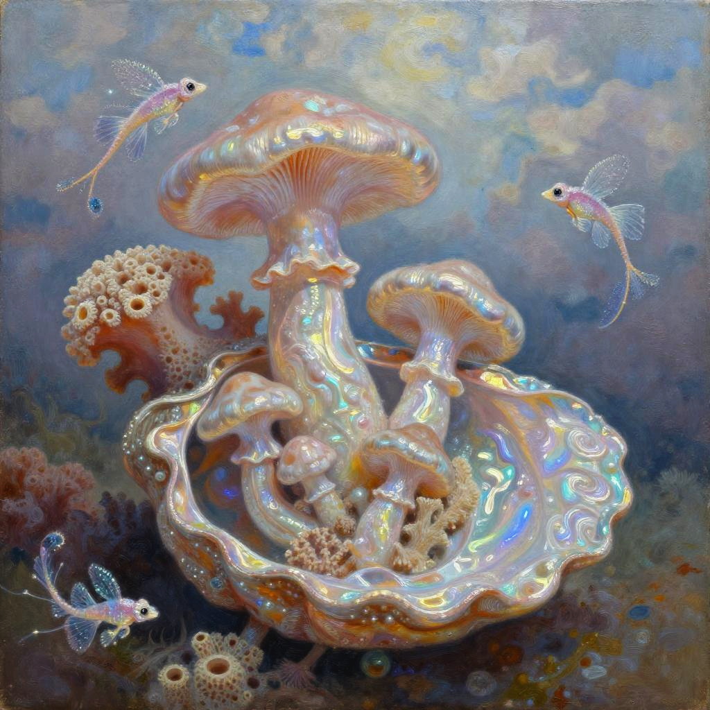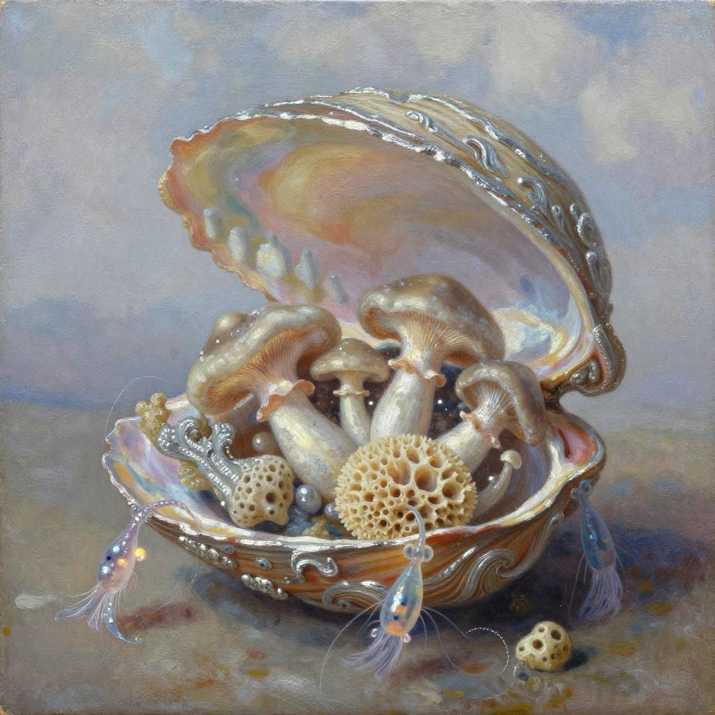 A ceramic lantern with stained glass panels brimming with pastel mushrooms and sponges, entwined in gothic arches with prismatic reflections, inhabited by phantom wisps with silver-blue auras, set against a diffuse cloudy sky, oil on canvas, hyperrealism, soft light palette, no hard shadows, blank edges.
