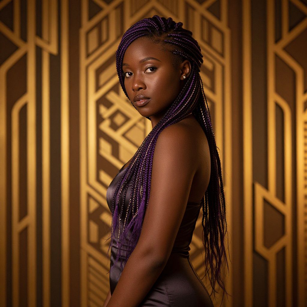 Black woman purple hair braided intricately with metallic threads, posing elegantly in an art deco styled room filled with golden geometric patterns, wearing a sleek evening gown, mood of sophistication and mystery, soft warm lighting highlighting facial features.