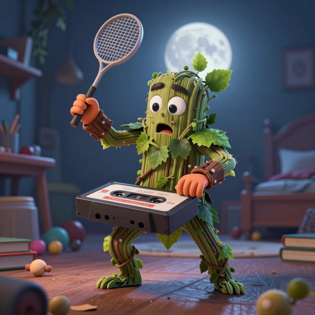 Anthropomorphic cassette tape DJ character with woven forest vines and leaves body, tiny leaf pauldrons and bark bracers, surprised but ready for action expression, mid-swing with a racket raised overhead in cozy bedroom floor scattered with toys and books, under cool moonlight with subtle blue tones, Pixar-style 3D animation, highly detailed, dynamic composition, 8k render