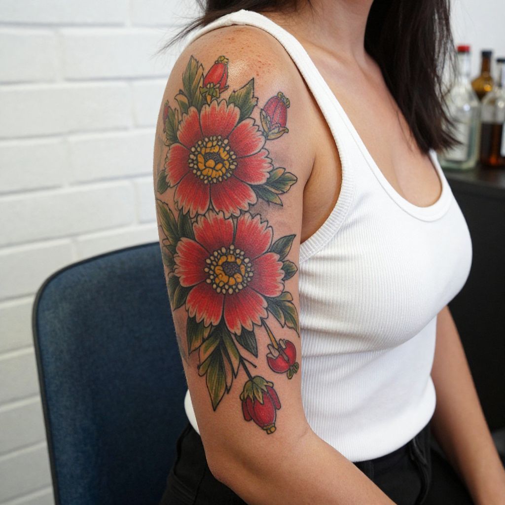 Vivid Red Floral Tattoo on Woman's Arm
