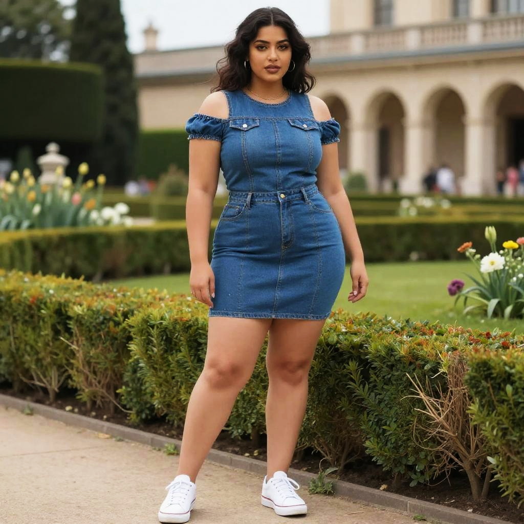 A Stocky woman in a contemporary denim fitted mini dress with shoulder cut-outs and white lace-up sneakers, standing by a historic garden, in the style of image comics. Sexy. Pretty face and beutiful eyes