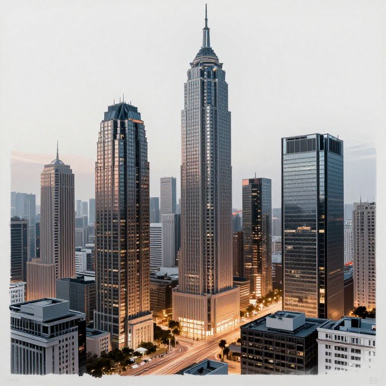 Digital photograph of a cityscape at dusk, featuring tall, illuminated skyscrapers with reflective glass windows, surrounded by smaller buildings and lit streets below.