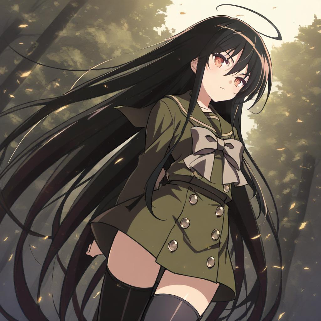Digital artwork of an anime girl with very long black hair and red eyes, wearing a green school uniform with a large bow and thigh-high black stockings. The character stands confidently in a forest setting with soft, warm lighting and falling particles around her. The style is inspired by the anime Shakugan no Shana, featuring detailed shading and expressive features.