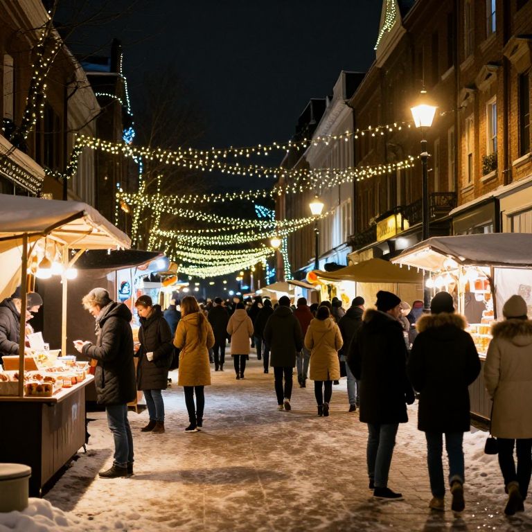 December city street at night, twinkling holiday lights strung between buildings, bustling crowd wrapped in warm coats, vendors selling hot drinks and treats, shimmering snow on pavement, festive decorations glowing warmly under street lamps