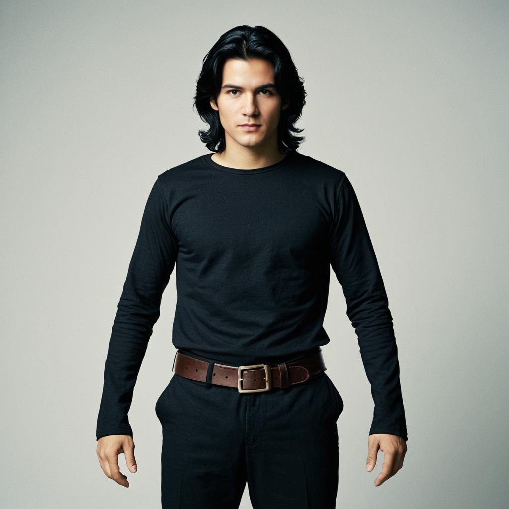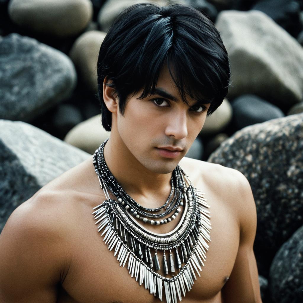 Close-up portrait of a young man with long black hair and thick eyebrows wearing an ornate gold crown with red and blue jewels. He has a serious expression with closed lips and is looking directly at the camera. The background is blurred, emphasizing the subject's face and upper body. The man is shirtless and wears a simple gold necklace.