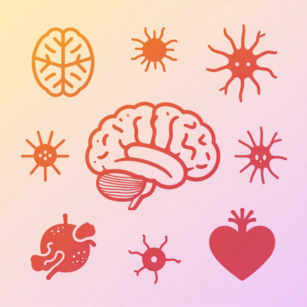Psychology background images presenting symbolic icons like brain, neurons, and heart merging into one, warm gradient of orange and pink, modern flat design, visually calming and balanced