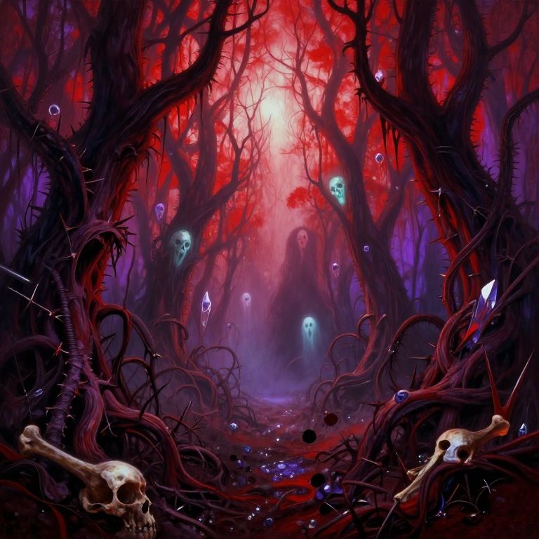 In groves of death, thorns, spikes, overgrown, twisted, gnarled, bones, fused bodies, multiple reflections, crystal, glow, silhouette, light particles, bright lit, fog, ectoplasm, claustrophobic, shimmer, bioluminescence, dark fantasy, horror theme, scary art, mysterious, dread, mourn, eerie, bio-organic art, macabre, lots of fine detail, vibrant, saturated, vibrant neon colors, deep rich color, painting, illustration, beyond-reality, visionary, surreal, disturbing, tragic, hdr, dreamcore painted in high resolution, The artwork effectively conveys a sense of mystery, horror, and intense emotion, H, Giger Zdzisław Beksiński Marc Simonetti Edvard Munch Salvador Dali Hieronymus Bosch Francisco Goya