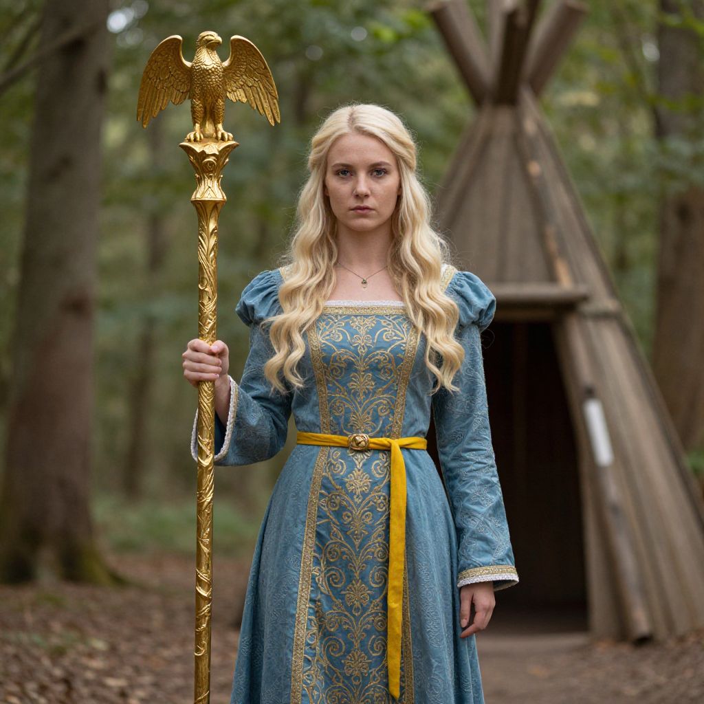 Photograph of a young blonde woman standing in a forest, holding a golden staff with an eagle head at the top. She wears a blue, long-sleeved dress with intricate gold embroidery and yellow trim, cinched at the waist with a yellow belt. Her long, wavy hair falls over her shoulders. In the background, there's a wooden teepee with a dark entrance, surrounded by tall trees and a forest floor covered in leaves and dirt. The woman's expression is serious and focused. The image has a fantasy, medieval vibe.