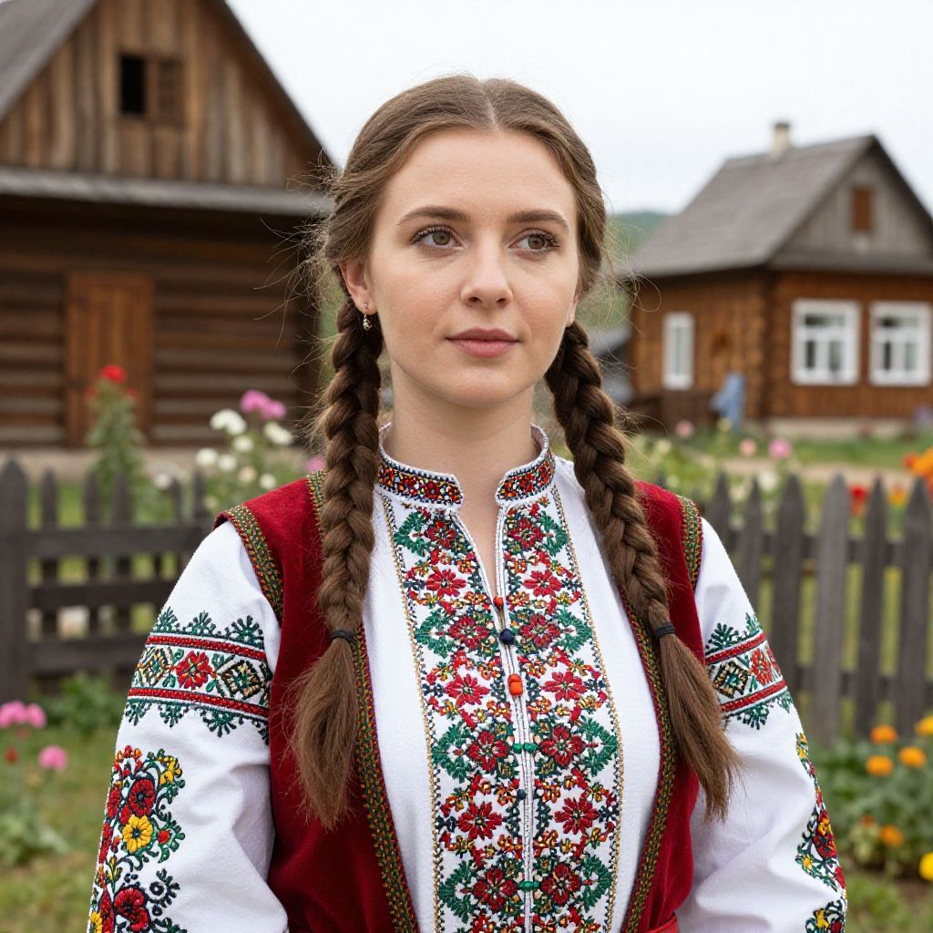 Portrait of Svetlana in traditional Eastern European folk costume, vibrant embroidery and intricate patterns, soft natural light enhancing her thoughtful gaze, rustic village backdrop with wooden houses and blooming flowers, warm color palette.