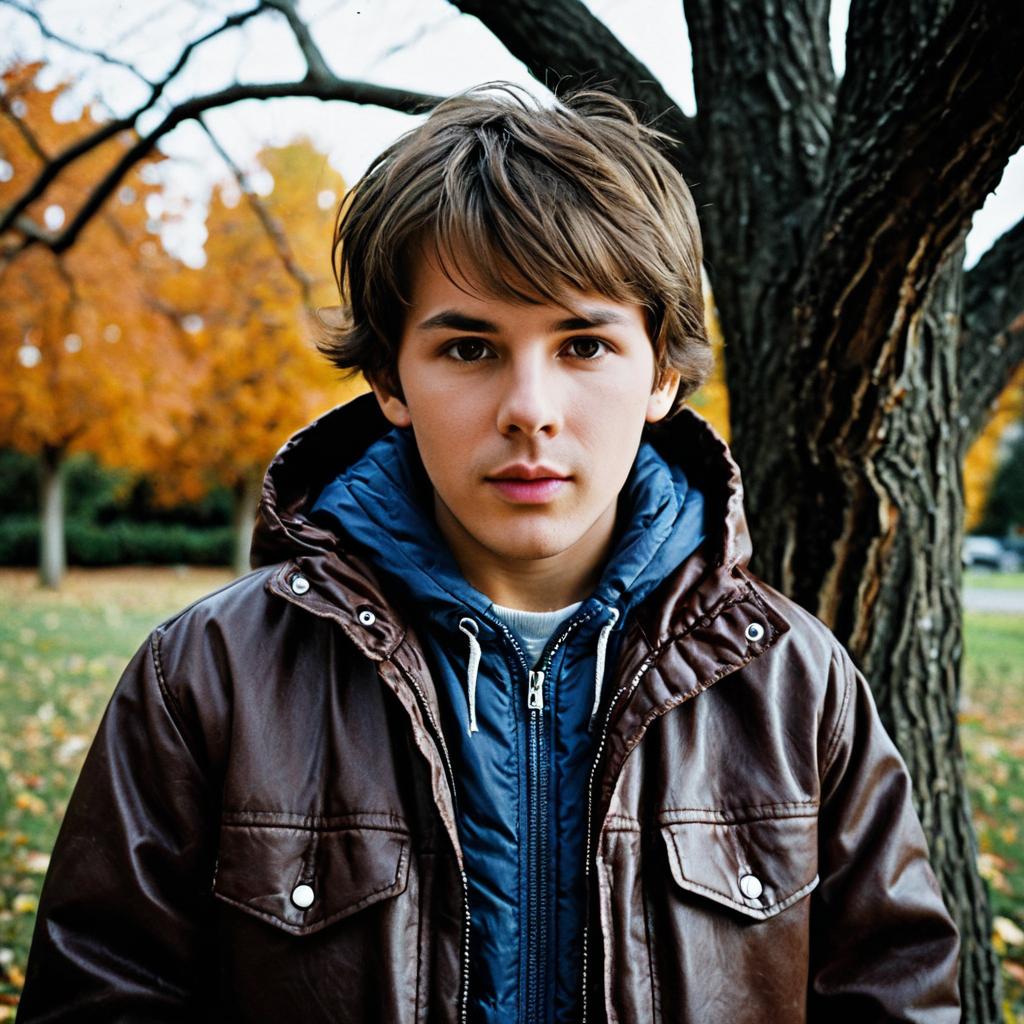 Close-up portrait of a young man with brown hair and brown eyes wearing a dark hooded jacket with white drawstrings. He is outdoors in a green field with blurred autumn trees in the background. The man has a neutral expression and looks directly at the camera.