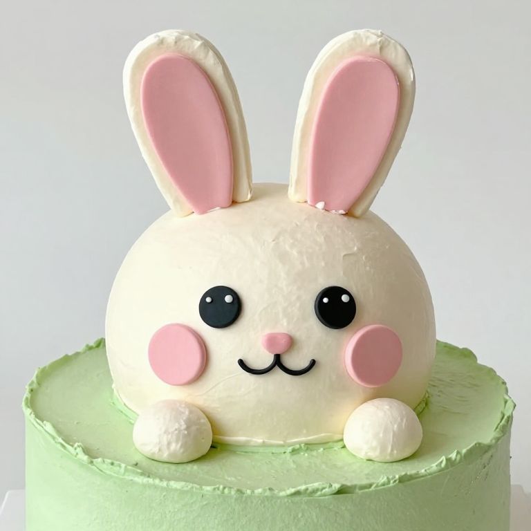 A whimsical cake crafted to resemble a cheerful bunny, adorned with pink ears, expressive black eyes, and a playful pink nose, set against a green frosted collar that defies the boundaries between dessert and fantasy.