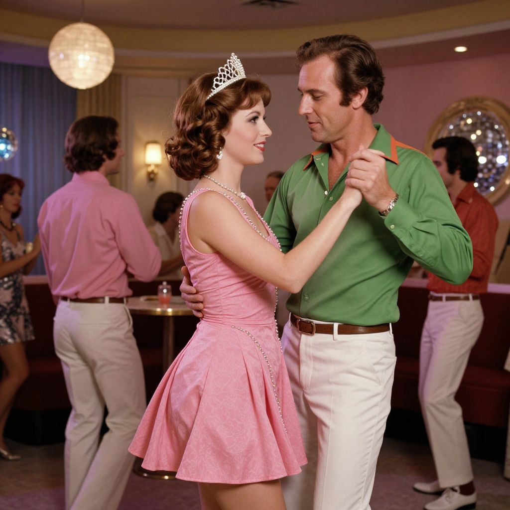 A woman in a pink dress and tiara dances with a man in a green shirt and another man in a pink shirt in a 1970s discotheque.